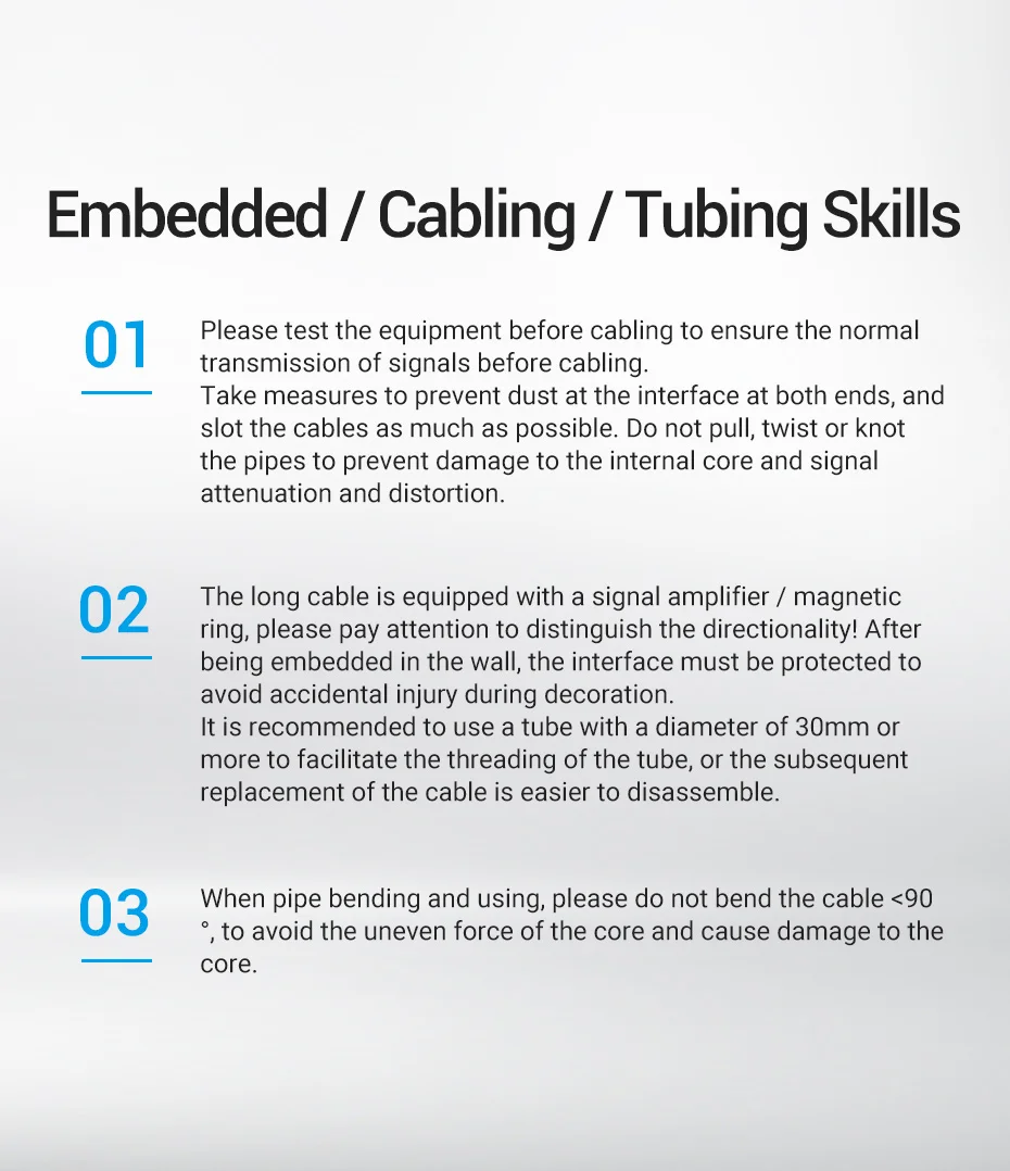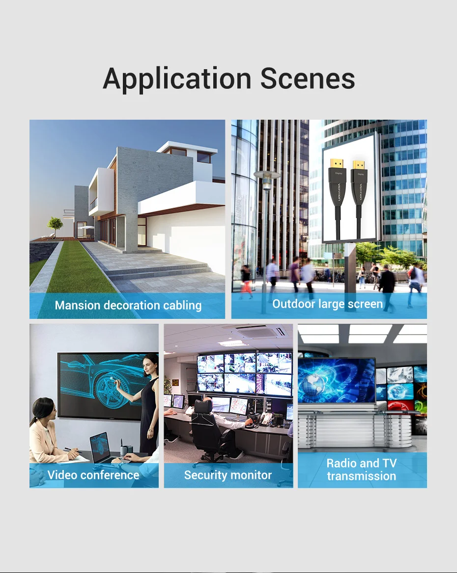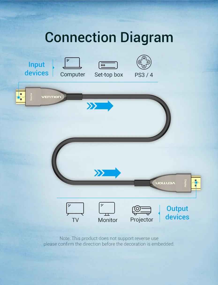 Вопросы и ответы: Вопрос: Есть ли излучение при передаче оптического волокна? A: сам оптический сигнал не имеет излучения, поэтому безопаснее использовать. В: при подключении можно ли подключить два конца По желанию независимо от направления? О: Этот продукт не поддерживает обратную передачу. Перед подключением убедитесь в правильности направления. Вопрос: при использовании кабеля структуры, влияет ли передача на дальние расстояния на сигнал? О: Передача Оптического волокна, большой объем связи, низкое затухание, отсутствие давления при 100 м передаче. Вопрос: Является ли кабель HDMI из оптического волокна очень хрупким? Нужно ли вам быть внимательным при использовании? О: испытанный Vention Lab, этот продукт может выдерживать радиус изгиба около 46 мм и угол изгиба 60 °, который не влияет на передачу сигнала и может быть использован с уверенностью.