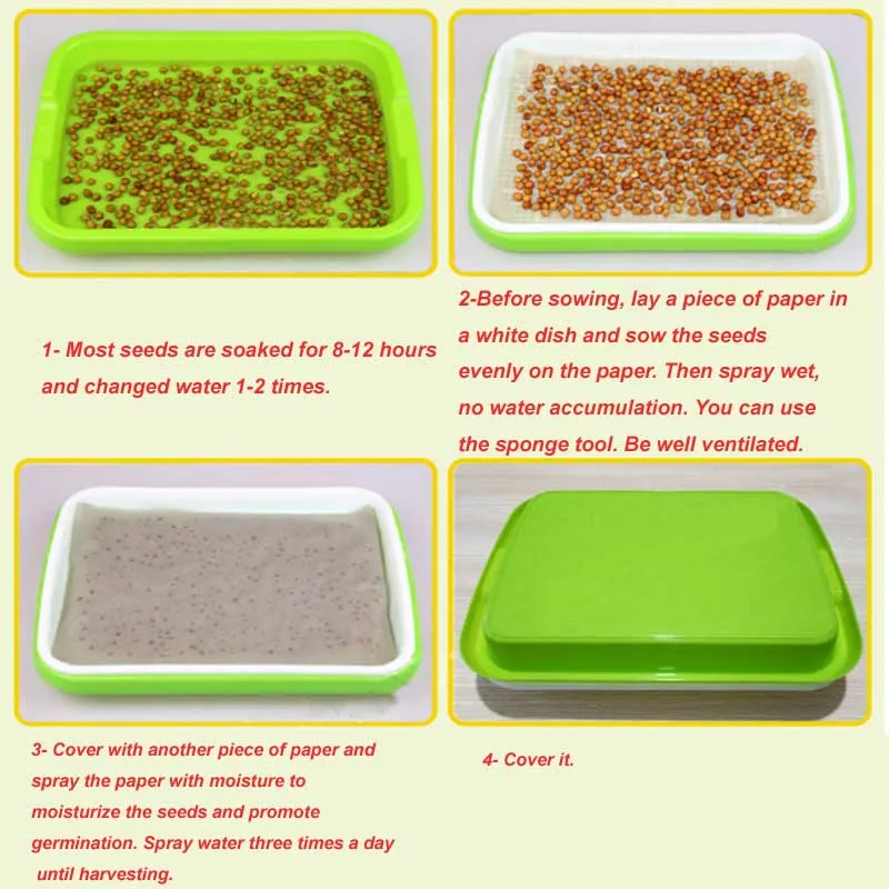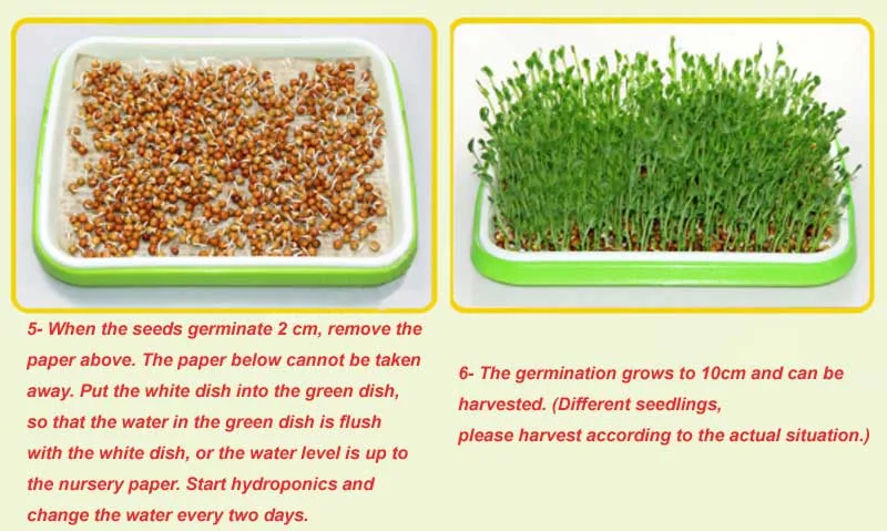 Большинство семян замачивают в течение 8-12 часов и 1-2 раза меняют воду. Перед тем как сеять, положите в Белое Блюдо кусок бумаги и равномерным образом засейте семена на бумагу. Затем распылите влажным, без скопления воды. Вы можете использовать губку. Хорошо вентилируется. Накройте еще одной бумагой и распылите бумагу влагой, чтобы увлажнить семена и затенить и повысить прорастание. Распыляйте воду три раза в день до уборки. Покройте его Когда семена прорастают 2 см, Удалите бумагу выше. Бумага, приведенная ниже, не может быть отобрана. Поместите Белое Блюдо в зеленое блюдо, чтобы вода в зеленом блюдо была погружена в Белое Блюдо, или уровень воды до детской бумаги. Запускайте гидропоники и меняйте воду каждые два дня. Всплеск роста до 10 см, и его можно собрать. (Различные саженцы, пожалуйста, урожай в соответствии с реальной ситуацией.)