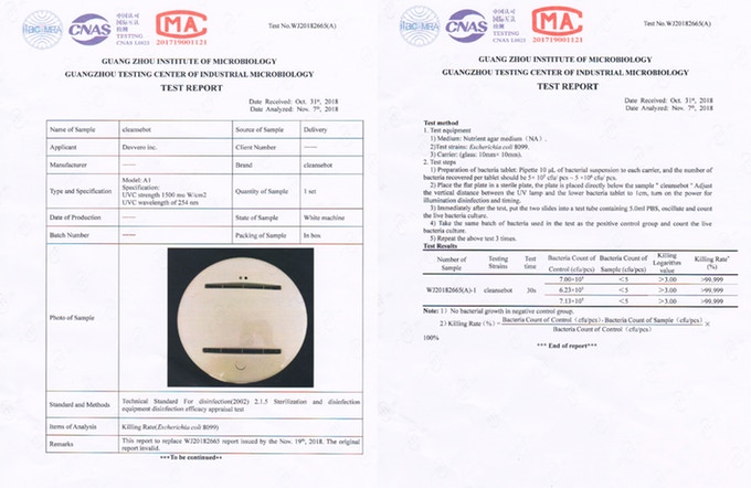 Мы протестировали CleanseBot с независимой третьей вечерние Центр тестирования, Guang Zhou Institute микробиологии и Guangzhou испытательный центр промышленной микробиологии.
