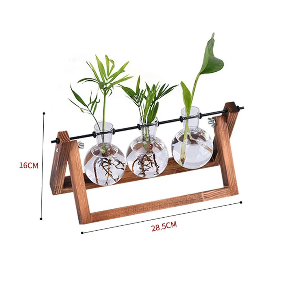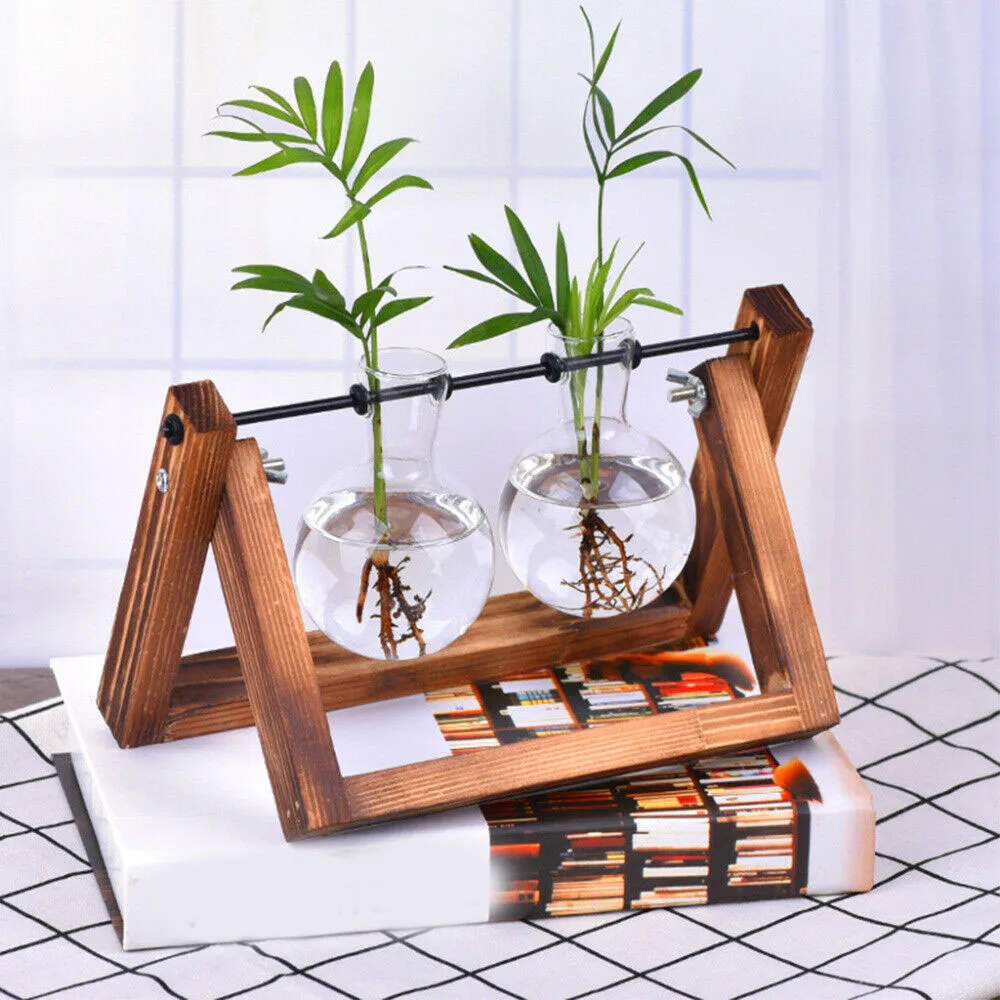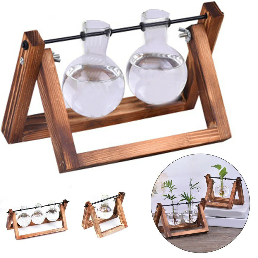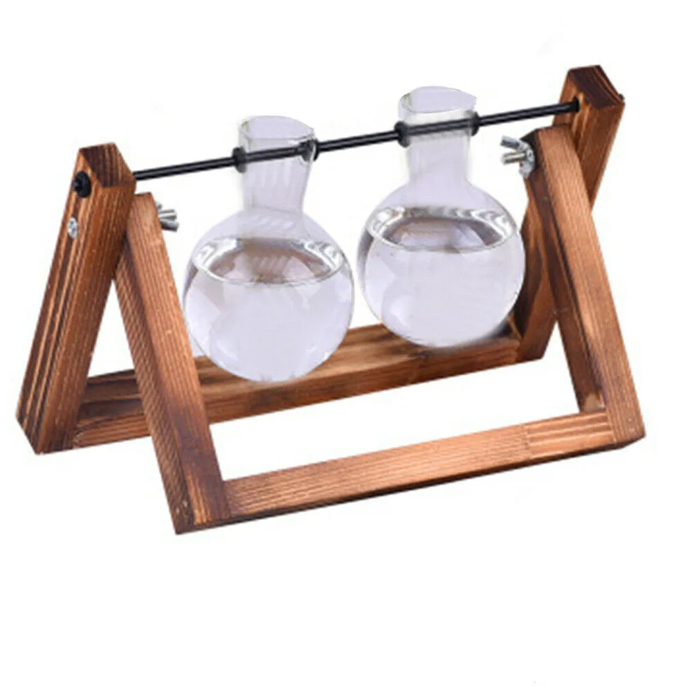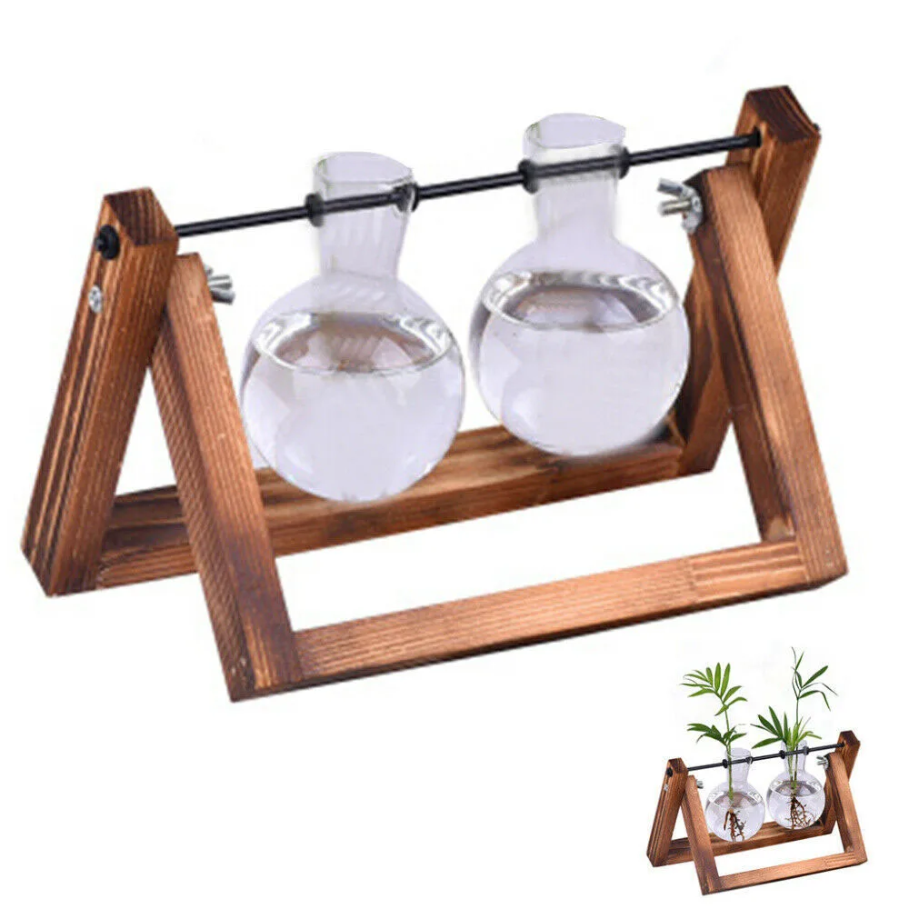 Деревенский деревянный и винтажный дизайн Настольный декоративный стеклянный плантатор, DIY Мини Лампа Форма ваза с регулируемой деревянной подставкой, гладкая поверхность, хорошая проницаемость.