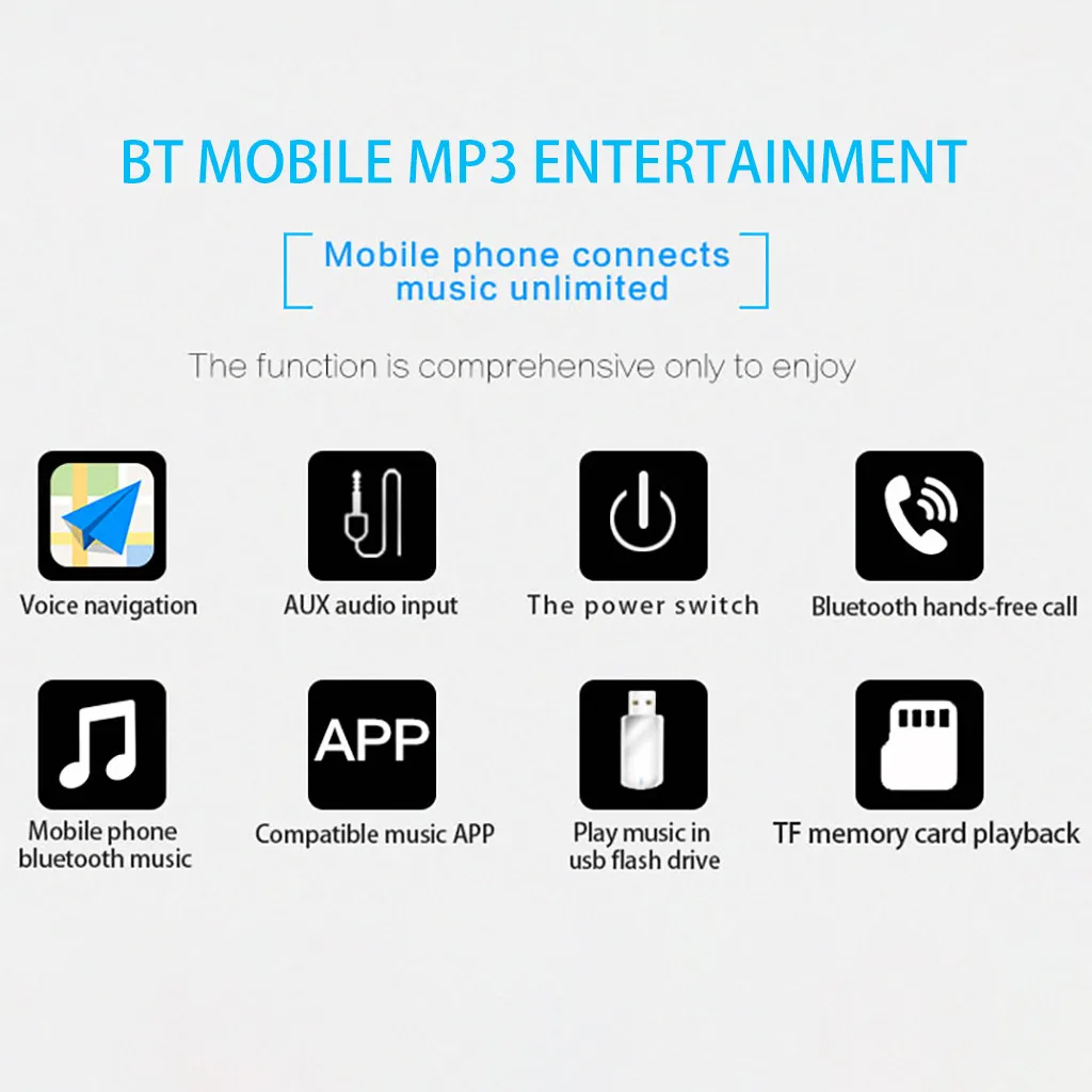BT телефон, музыка без потерь Новое разрешение, развлечение автомобиля Автоматическое подключение, мобильное приложение для музыки/U диск plug and play BT car MPA3 развлечения Поддержка: голосовая навигация, аудиовход AUX, FM-радио, BT-звонки, мобильный телефон, BT Музыка, воспроизведение U-диска, воспроизведение карты памяти TF. Smart Wendeng BT link. FM-радио с защитой от помех. Четырехканальный стерео звук. Память отключения питания, длительный срок службы батареи.Технические характеристики: