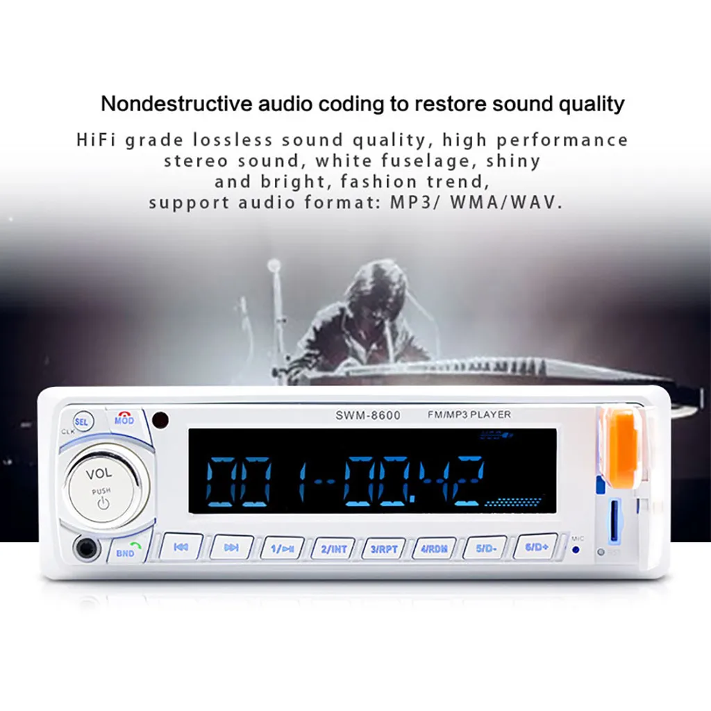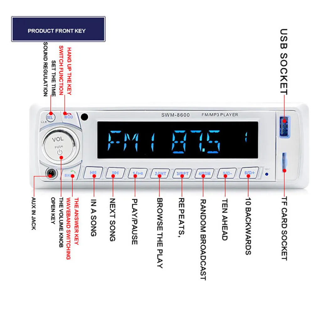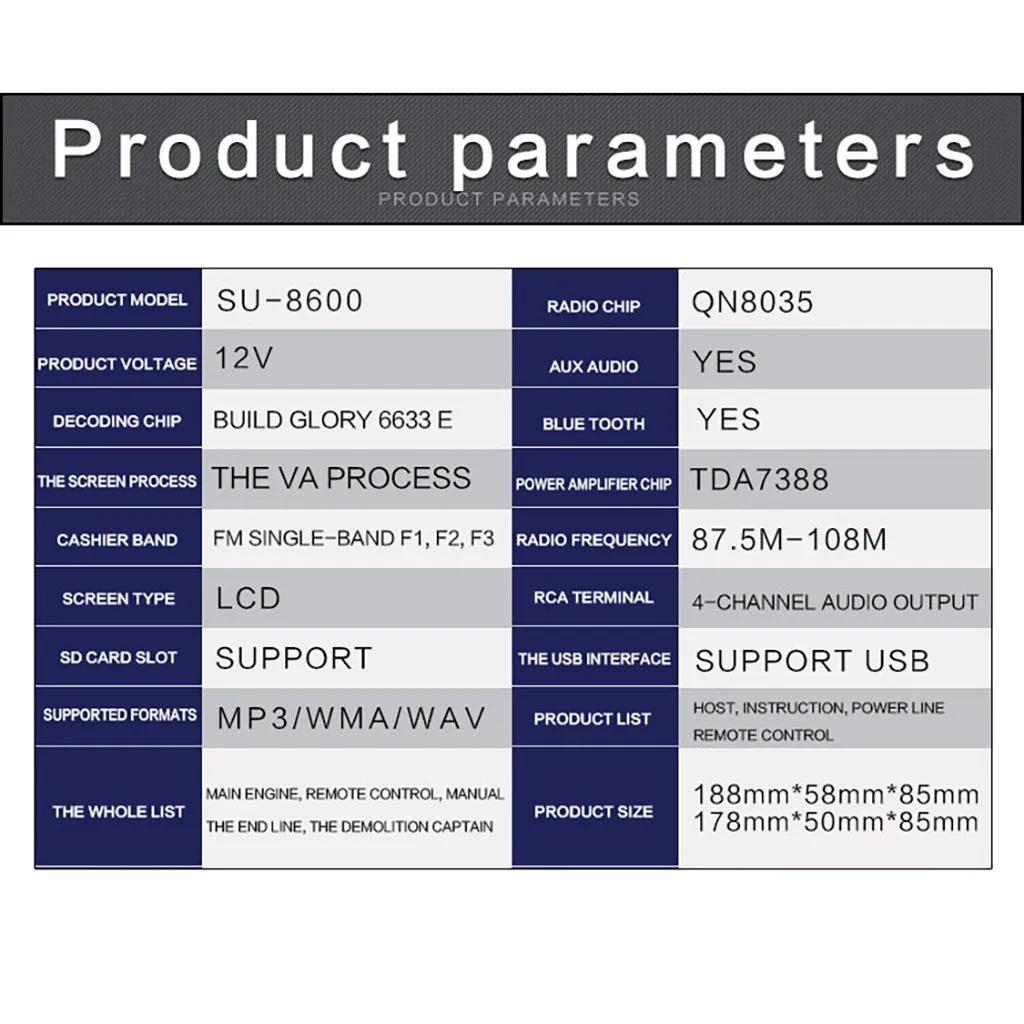 Модель продукта: SU-8600 Радио чип: QN8035 Напряжение продукта: 12 В AUX Аудио: поддержка Чип декодирования: Jianrong 6633E Bluetooth: Поддержка Технология экрана: процесс VA Чип усилителя мощности: TDA7388 Кассовая лента: FM однодиапазонный F1F2, F3 Аудио Частота: 87,5 М-108 м Экран Тип: lcdrca терминал 4-канальный аудио выход Слот для sd-карты: Поддержка Вспомогательный интерфейс: USB2.0 Поддерживаемый формат: MP3 WMA/WAV Размер продукта: 18,8x5,8x7,5 см Размер упаковки: 20,5х8х12, 5 см Вес изделия: 460 гПосылка включает в себя:
