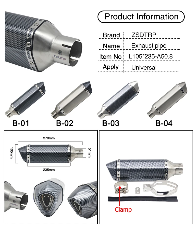 100% новый и высокое качествоМодный дизайн, отличный аксессуар для ваших поездок.Сварочный адаптер из нержавеющей стали позволяет соответствовать диаметру трубы 38 мм-51 мм.Продается с зажимом и фурнитурой, как на картинке.Это универсальный глушитель, который используется для велосипеда грязи, уличного велосипеда, скутера, квадроцикла и любого другого велосипедаМодель A38-51 мм выхлопной весь костюм01/03/05/06/07/08/09/12 основной корпус из Алюминий сплав, чехол для задней крышки и Интерфейс, нержавеющая стальМодель ниже 600cc moto02/04 основной корпус, задняя крышка и интерфейс из нержавеющей стали10 основной корпус, задняя крышка и интерфейс-настоящий Титан11 основной корпус и интерфейс-настоящий титаниум, задняя крышка из углеродного волокнаПосылка включает в себя:1 шт. выхлопная труба1 шт. дБ убийца1 шт. адаптер1 шт. Зажим и Резина1 стикер2 шт. пружины и крючкиМодель BТолько для 51 мм exhasut01/03 основной корпус из алюминиевого сплава, задняя крышка и интерфейс из нержавеющей сталиМодель ниже 600cc moto02/04 основной корпус, задняя крышка и интерфейс из нержавеющей сталиПосылка включает в себя:1 шт. выхлопная труба2 шт. Зажим1 шт. Резина1 стикер1 шт. аксессуары