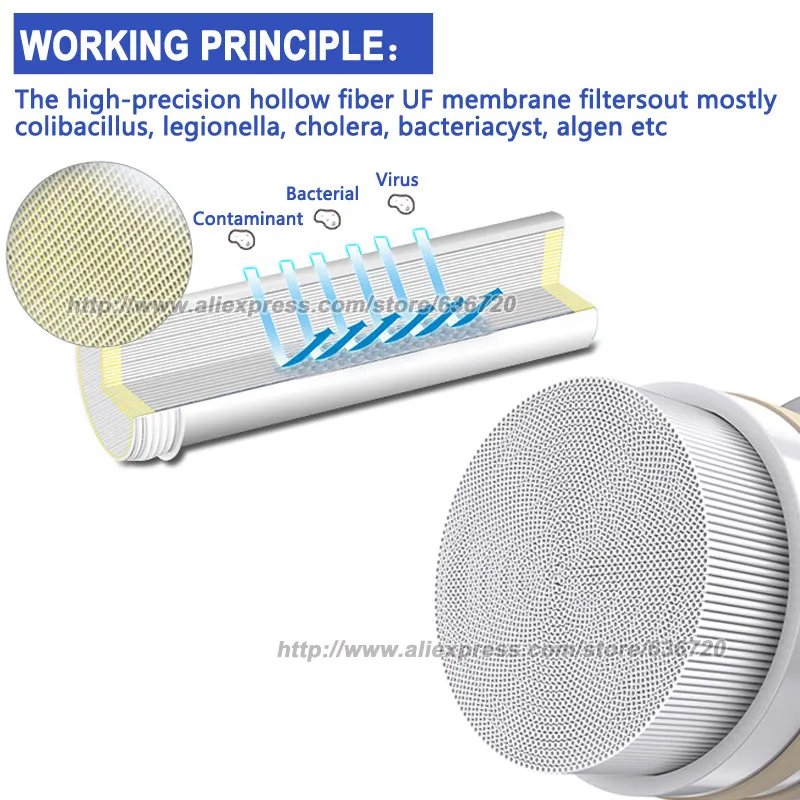 Фильтр является немецкой технологией PVDF мембраны, лучший ультра фильтрующий материал. PVDF является высокопрочным, коррозионно-стойким веществом. При изготовлении головки используется пищевой полипропилен, коагулум является эпоксидной смолой-медицинский материал. Водонепроницаемое кольцо используется силикагель-медицинский материал.