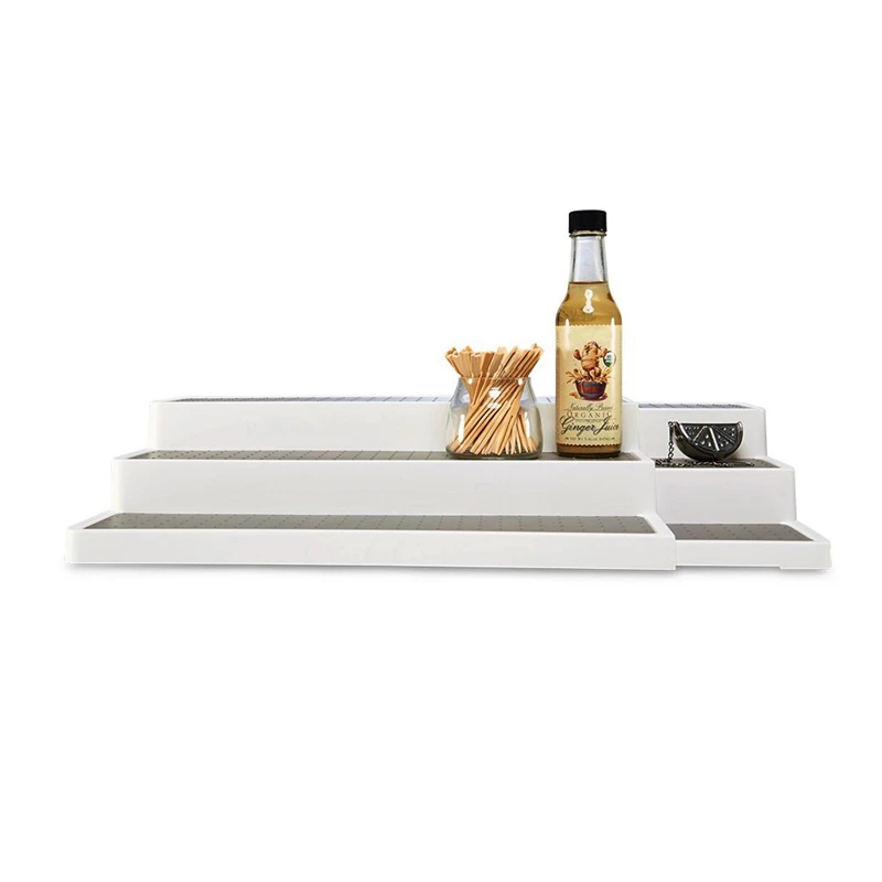 Расположите предметы, такие как специи, банки и банки, на многоуровневых полках, чтобы сохранить все предметы на виду