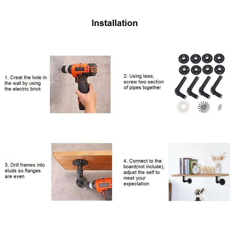 1. Наша настенная полка изготовлена из высококачественных и Прочных Промышленных фитингов для труб. Поверхность плавающих полок гладкая, устойчивая к коррозии, ржавчина и устойчивость к воздействию кислот, долговечная и надежная!