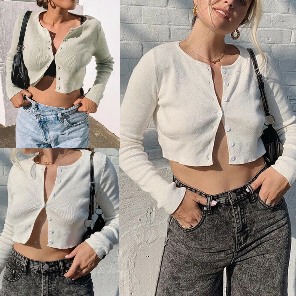 Женский укороченный топ с V-образным вырезом и пуговицами и длинными рукавами, вязаный свитер, кардиган, S-L