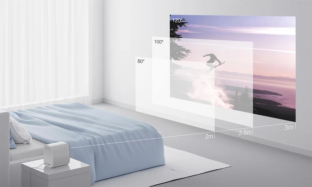 Проекционное отношение 1.2:1 подходит для большинства комнат в обычных квартирах. Вы можете легко отрегулировать расстояние проекции для получения гигантского экрана в пределах 40-200 дюймов. Смотрите фильмы, наслаждайтесь концертами и играйте в игры, все это на обычной стене.