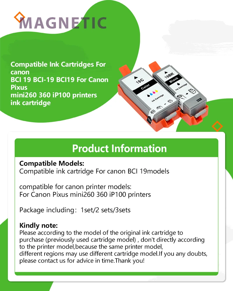 Совместимый чернильный картридж: для моделей canon BCI 19 Совместимость с моделями принтеров canon:Для принтеров Canon Pixus mini260 360 iP100 Посылка включает в себя: 1 комплект/2 комплекта/3 комплекта Пожалуйста, обратите внимание Пожалуйста, в соответствии с моделью оригинального чернильного картриджа Покупка (ранее использованная модель картриджа), не напрямую согласно К модели принтера, потому что та же модель принтера, В разных регионах могут использоваться различные модели картриджей. Если у вас есть какие-либо сомнения, Пожалуйста, свяжитесь с нами для консультации вовремя. Спасибо!