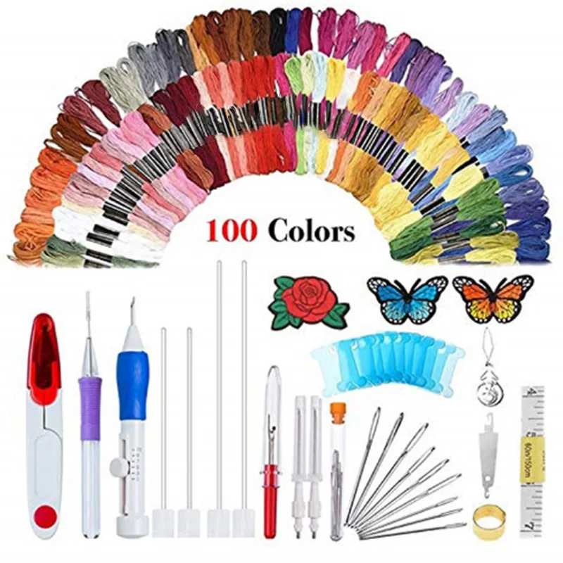 100 цветных нитей + 1 синяя ручка для вышивки (3 модели со съемной головкой) + 1 средство для удаления резьбы + 1 бутылка игл для вышивки (9 шт.) + 1 ножницы + 10 намоток Доски + 1 рулетка + 1 наперсток + 2 иглы + 4 направляющих резьбы + один резец резьбы + вышитые наклейки 3 5 бамбуковых кругов для вышивки 2 шт. 30 * 30ccm 11CT ткань для вышивки