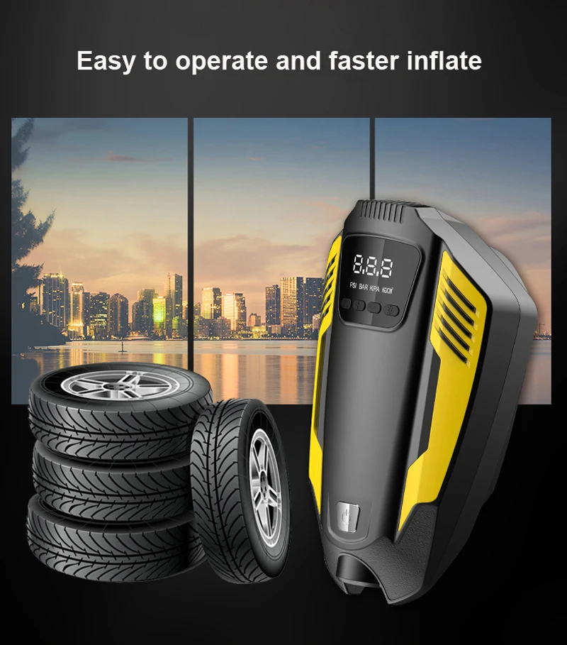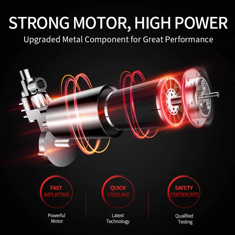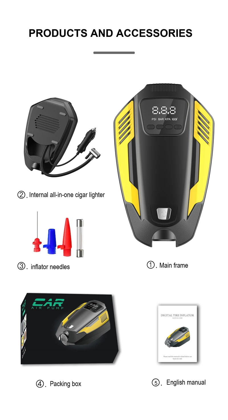 Простота в использовании и быстрое надувание-просто подключите воздушный насос для автомобильных шин к розетке 12 В и установите желаемое давление. Начните надувать с помощью одной кнопки. Мощный двигатель позволяет шинному насосу быстро надуть ваши автомобильные шины. Эти превосходные функции делают Надувное устройство для автомобильных шин идеальным выбором для людей на ходу. Отличное решение для чрезвычайных ситуаций. Автоматическое отключение-не беспокойтесь о том, что автомобильные шины будут завышены. Автомобильный воздушный компрессор автоматически отключается после того, как ваши автомобильные шины достигают желаемого давления. Отличная шина с манометром держит ваши автомобили в безопасном состоянии на всем пути. Светодиодный светильник ING & DIGITAL DISPLAY-портативный шинный инфлятор для автомобиля со встроенным светодиодный светильник. 3 режима-освещение, защита и SOS отвечают различным требованиям в любое время. Цифровой дисплей для шинного насоса не только хорошо работает в дневное время, но и легко улавливает ваше желание в темноте. Дополнительные насадки и 11 футов-большой диапазон-компактный автомобильный надувной насос с 3 дополнительными насадками. Различные насадки позаботятся о ваших различных надувных нуждах для ваших велосипедов, воздушной кровати, баскетбольных мячей и футбольных мячей и т. д. Кроме того, шнур питания воздушного компрессора составляет 11 футов, что достаточно долго, чтобы надуть каждую шину с легкостью. Это очень удобно для вас! Что вы получите-обещает вам новый Замена или полный возврат средств при нормальном использовании в течение 2 лет. Просто свяжитесь с нами, если у вас есть какие-либо проблемы с электрическим воздушным насосом. Многофункциональный светодиодный светильник Воздушный насос имеет яркий светодиодный светильник, чтобы увидеть в темноте. С 3 режимами освещения-освещение, Предупреждение и SOS, устройство будет работать хорошо в любое время. Мощный мотор Разработан с высоким качеством мотора позволяет воздушный насос жля надувания ваши автомобильные шины быстро. Кроме того, металлический двигатель долговечен в использовании. Экономьте свое время и деньги. 11 футов длинный шнур питания Чем дольше шнур питания, тем легче будет надувать. Длина достаточно длинная, чтобы надуть каждую автомобильную шину с легкостью. Не нужно снимать воздушный насос время от времени. Пневматический насос Накачка шин достаточно мала, чтобы поместиться в багажник. Портативный, удобный и простой в переноске. Эта функция делает его отличным решением для чрезвычайных ситуаций. Цифровой Дисплей Надувное устройство с большим высокоточным цифровым дисплеем поможет вам точно прочитать требуемые значения на основе различных единиц (PSI, BAR, KPA, KG/cm2) и четко контролировать ваш процесс надувания. Удобного хранения Хранение также имеет ключевое значение. Встроенный ящик на воздушном насосе предназначен не только для хранения шнура питания, но и продлевает срок службы оборудования. Посылка в том числе 1 * воздушный компрессор 1 * шариковая игла 1 * воздушный сопло