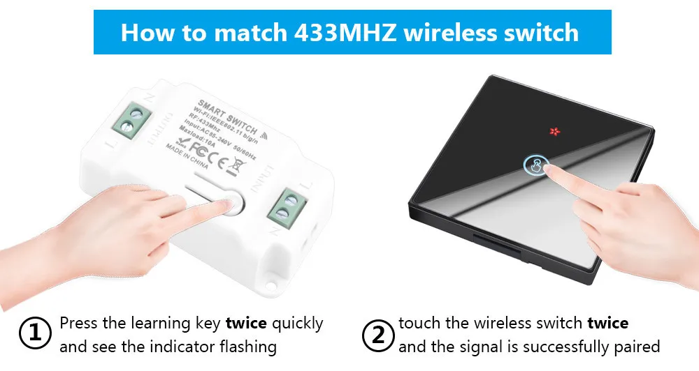 1 Нажмите клавишу обучения дважды быстро и посмотрите мигающий индикатор 2. Дважды нажмите беспроводной переключатель, и сигнал успешно сопряжен