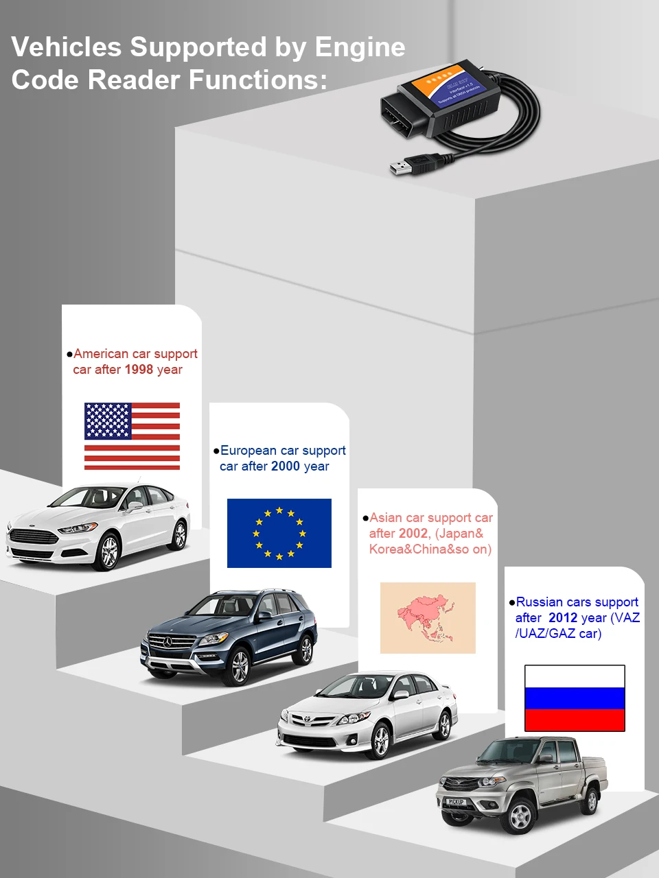 YA101 инструмент сканирования поддерживает большинство протоколов OBD2 и EOBD и CAN Vehciles: Американский автомобиль: стандартные протоколы OBD2 с 2000 по настоящее время; Европейский автомобиль: стандартные протоколы OBD2 с 2003 года по настоящее время; Японский/Корейский автомобиль: стандартные протоколы OBD2 с 2006 года по настоящее время.