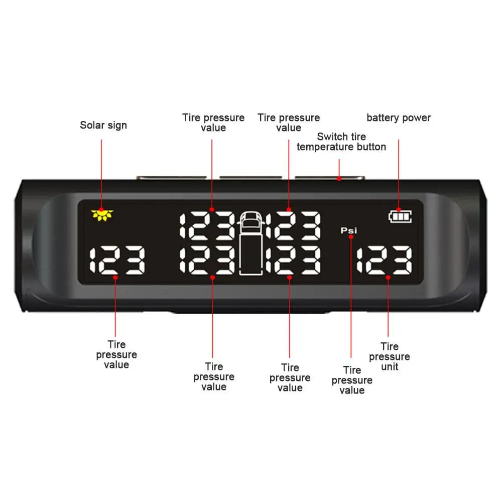 * Мониторинг состояния шин в режиме реального времени, когда давление и температура в шинах слишком высокие или низкие, дисплей излучает звуковой сигнал и отображает значение давления и температуры в шинах в реальном времени