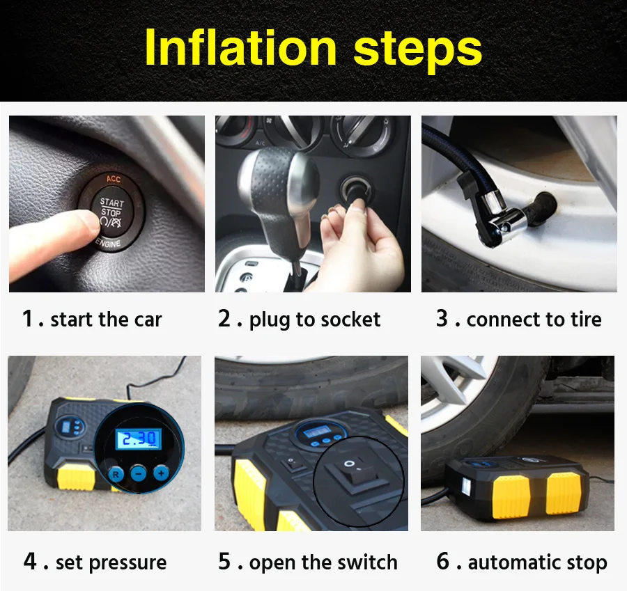 6. Отлично подходит для многих типов шин: автомобиль, велосипед, мотоцикл, RV, SUV, ATV, резиновая лодка, а также спортивное оборудование и надувные лодки. Три дополнительных насадки и адаптеры в комплекте, чтобы сделать компрессор универсальным и более широким.