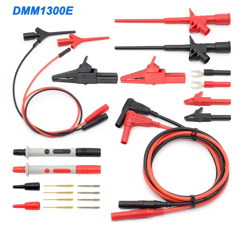 Многофункциональный набор тестовых датчиков для измерения тока Модель: DMM1300B & DMM1300C & DMM1300D & DMM1300E & DMM1300F Список продуктов: 1. 4 мм штепсельная вилка типа банан-Тестовые провода штепсельной вилки * 2 (красный черный каждый 1, длина провода: 100 см) 2. Подключаемый мультиметр зонд: Тестовая настольная палка * 2 (красный черный каждый 1) Сменные иглы (позолоченная Острая Игла * 4, стандартная игла * 4) Защитная крышка * 2 (красный черный каждый 1) 3. Маленький крокодил * 2 (красный черный каждый 1) 4.IC Тест Крюк * 2 (красный черный каждый 1)-- DMM1300C & DMM1300D & DMM1300E & DMM1300F 5. Большой Крокодил * 2 (красный черный каждый 1)-- DMM1300D & DMM1300E & DMM1300F 6.7.2 мм u-образный разъем типа банан * 2 (красный черный каждый 1)-- DMM1300D & DMM1300E & DMM1300F 7. Гибкий испытательный крюк * 2 (красный черный каждый 1)-только DMM1300E и DMM1300F 8. Тест на прокол * 2 (красный черный каждый 1)-только DMM1300F 9. Пробивная игла * 2 (красный и черный каждый 1)-только DMM1300F