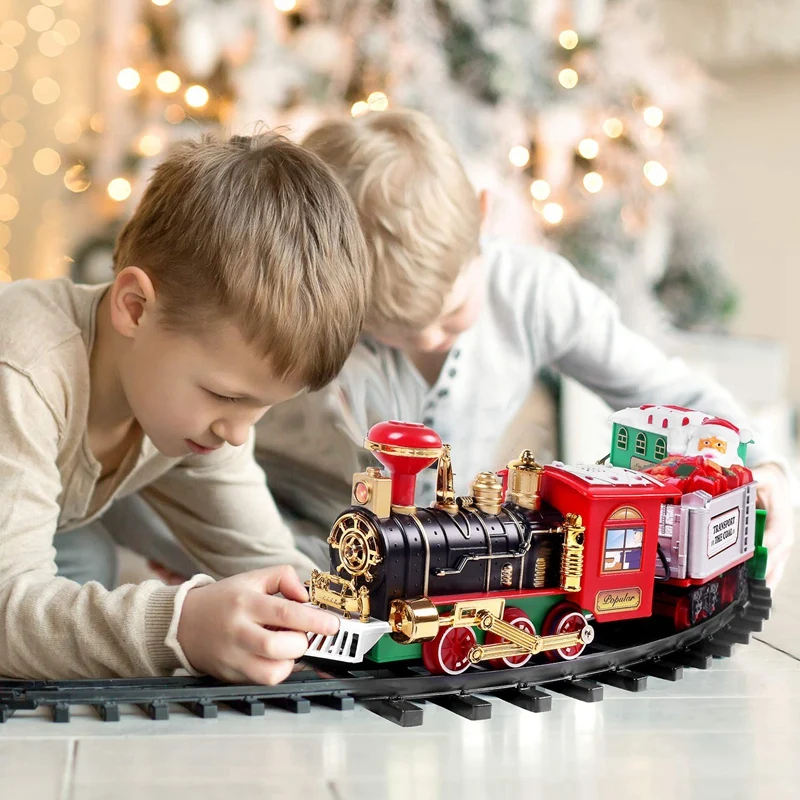 [Безупречный Рождественский набор поездов] Он поставляется с 4 машинами и дорожками и удобно питается от 4 батареек АА (не входят в комплект). Санта-Клаус, поезд с рождественскими подарками, Аутентичные звуки поезда, рабочая фара, принесите в вашу комнату сезонную анимацию на Рождество с потрясающим классическим набором поездов. Настройте дорожку вокруг основания рождественской елки и наблюдайте, как поезд кружится вокруг, чтобы поприветствовать свою семью с choo рождественского приветствия!