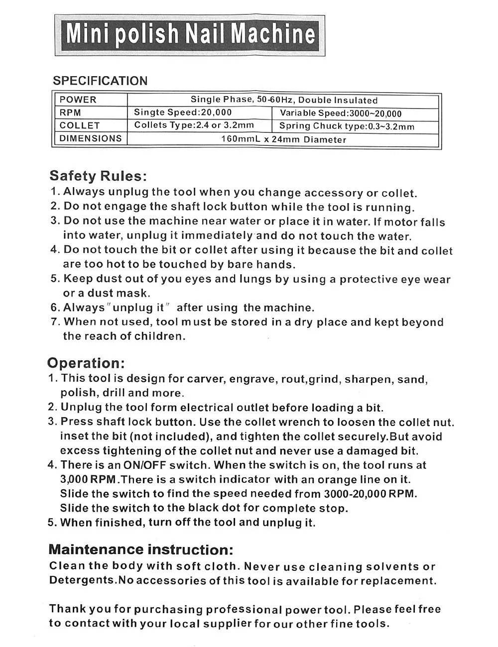 20000 ОБ/мин Профессиональный лак для ногтей электрическая пилка для ногтей дрель маникюрная машина 1 Набор 6 бит ручка для маникюра педикюр пилка для ногтей Особенности: -Отсоедините инструмент от электрической розетки перед загрузкой. -Нажмите кнопку, чтобы зафиксировать вал, используйте цанговый ключ, чтобы ослабить гайку цанга. Вставка Немного и надежно затяните цанговый слой, но Избегайте чрезмерного затягивания Коллет гайки и никогда не использовать поврежденные бит. -Есть переключатель ВЫКЛ/вкл. В тех случаях, когда переключатель включен, средство работает на более низкой скорости в самом начале, сдвиньте переключатель для того, чтобы найти скорость необходимо от 3000 до 20000 об/мин. Сдвиньте переключатель в сторону выключения для полной остановки. -После завершения выключите инструмент и отключите его. Параметры: -Совершенно новая электрическая дрель для ногтей -Вес и портативный светильник -Плавная регулировка скорости: 3000 об/мин до 20000 об/мин -Цанги типа: 2,4 мм -Напряжение: AC 100-240V (штепсельная Вилка европейского стандарта) 50/60HZ -Размеры: 160 мм x 24 мм -Мульти использование: резьба, гравировка, маршрутизация, шлифовка, заточка, шлифовка, полировка, Бурение и так далее -Цвет: розовый -Размер упаковки: 210*95*50 мм -Вес нетто: 190 г Посылка Содержание: 1 x электрическая дрель для ногтей 1 х адаптер переменного тока (у нас есть штепсельная вилка европейского и американского стандарта, пожалуйста, выберите свой стиль) 6 x бит (5 алмазных бит, 1 наждачный стержень с 6 шлифовальными лентами) Руководство пользователя (на английском языке)-1 шт.