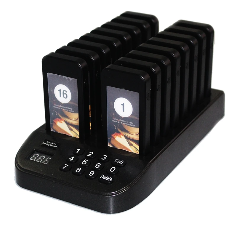 Беспроводная система очереди включает в себя 999-канальную клавиатуру, беспроводную кнопку вызова и 16 беспроводных пейджеров.