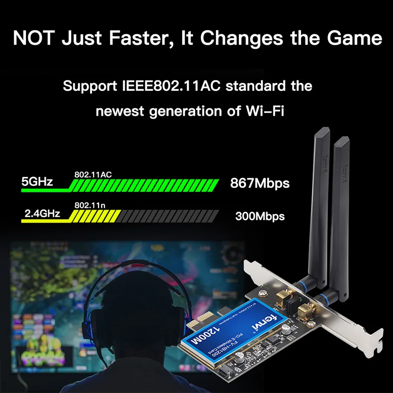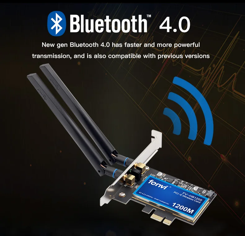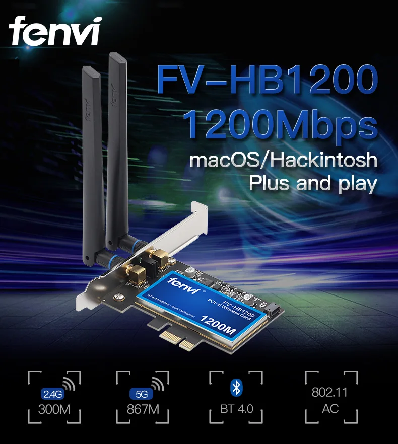 Модель: FV-HB1200; Беспроводной скорость передачи данных: 5GHz-867Mbps, 2,4 ГГц-300 Мбит/с; IEEE WLAN Стандартный: IEEE 802.11a/b/g/n/ac; Потока: 2X2; Версия Bluetooth: Bluetooth 4,0 (Поддержка Apple Bluetooth клавиатура, магия Мышь, Magic, трекпад, Bluetooth гарнитура); Разъем Интерфейс: разъем PCI Express 1X, 4X, 8X, 16X; Совместимость материнская плата Чипсет: Intel и AMD на платформе; Частота: Dual Band 2,4/5 ГГц; Антенна: 2 x 6dbi антенны;