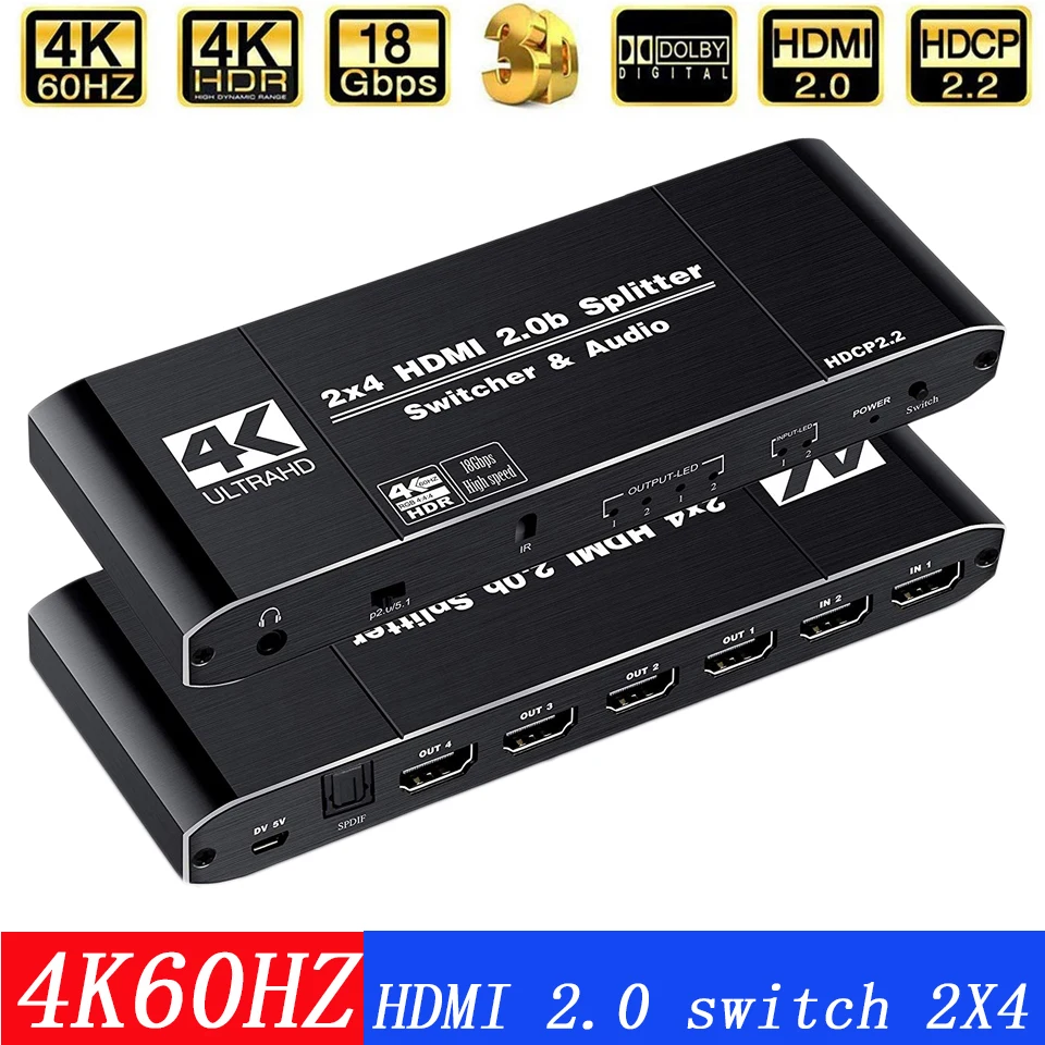 2020 Best 4K HDMI 2.0 Switch Remote 2x4 HDR HDMI Switch Audio Extractor With IR 2x2 YUV 4:4:4 Switch HDMI 2.0 For PS4 Apple TV