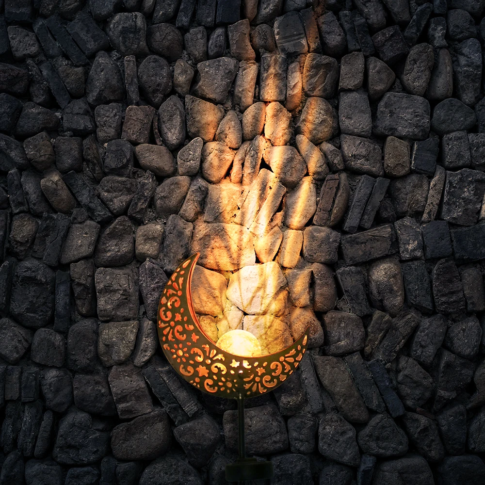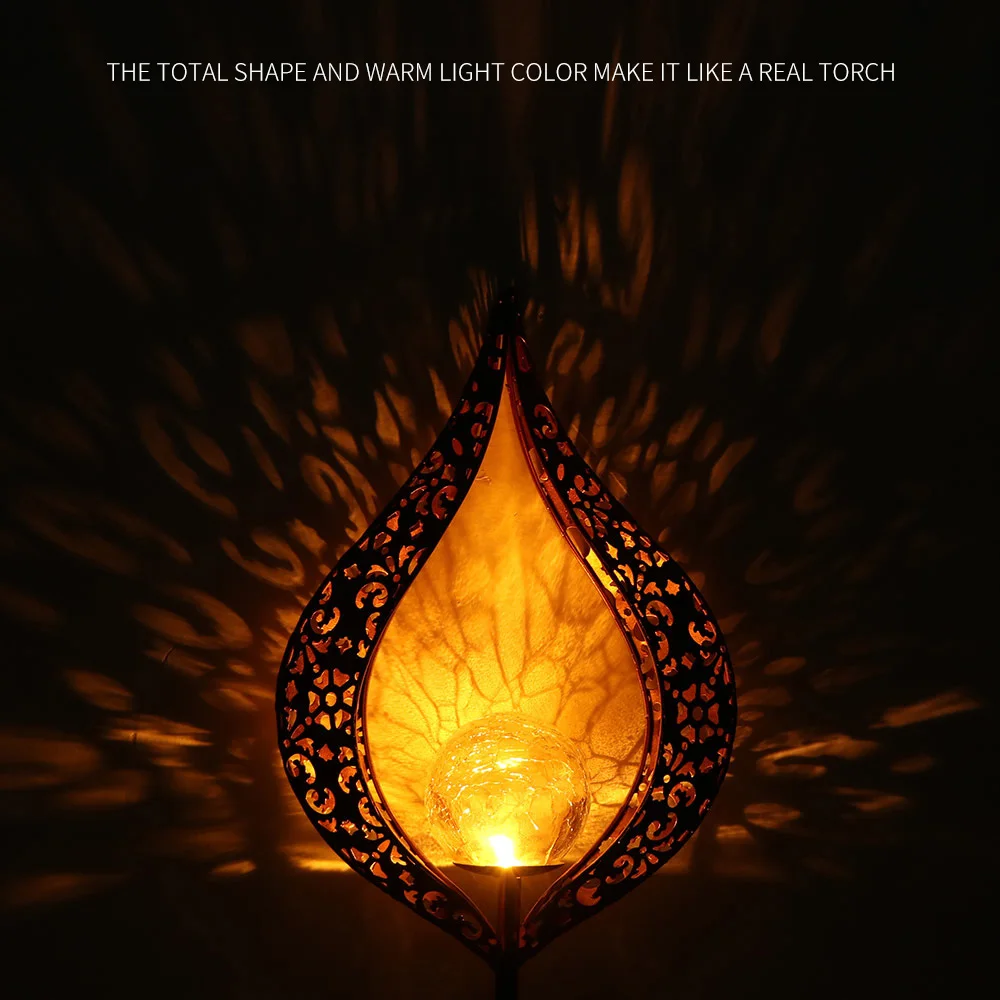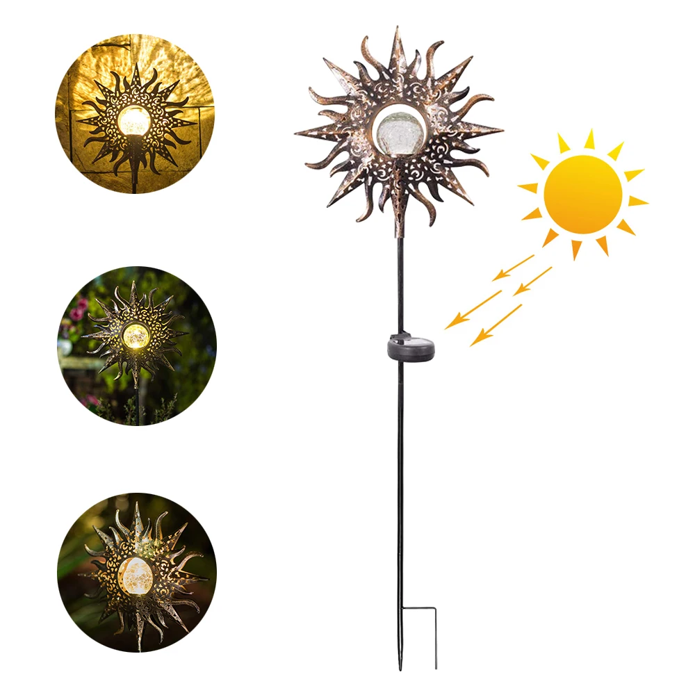IP55 Waterproof The solar powered lights passed waterproof test, suitable work in outdoors, can work under rainy and snowy days. Hollow Sun Shape The LED warm light is designed with glass globe, with a hollow sun shell, it makes your garden filing with a sense of fairy tale. Warm White LED Lamp The lamp is designed with warm white LED. The reflection of the pattern is beautiful enough to make a romantic atmosphere. Long life This LED light can work for 6-8 hours after exposed to sun for 8 hours, and its lifespan is about 5000 hours. Easy Installation With garden stake stand, no wiring or external electricity are required. The LED light is powered by solar energy, no cost lighting. Scopes of Application Made of durable iron and glass, this solar LED light can be used for decorating your pathway, garden, lawn or courtyard.
