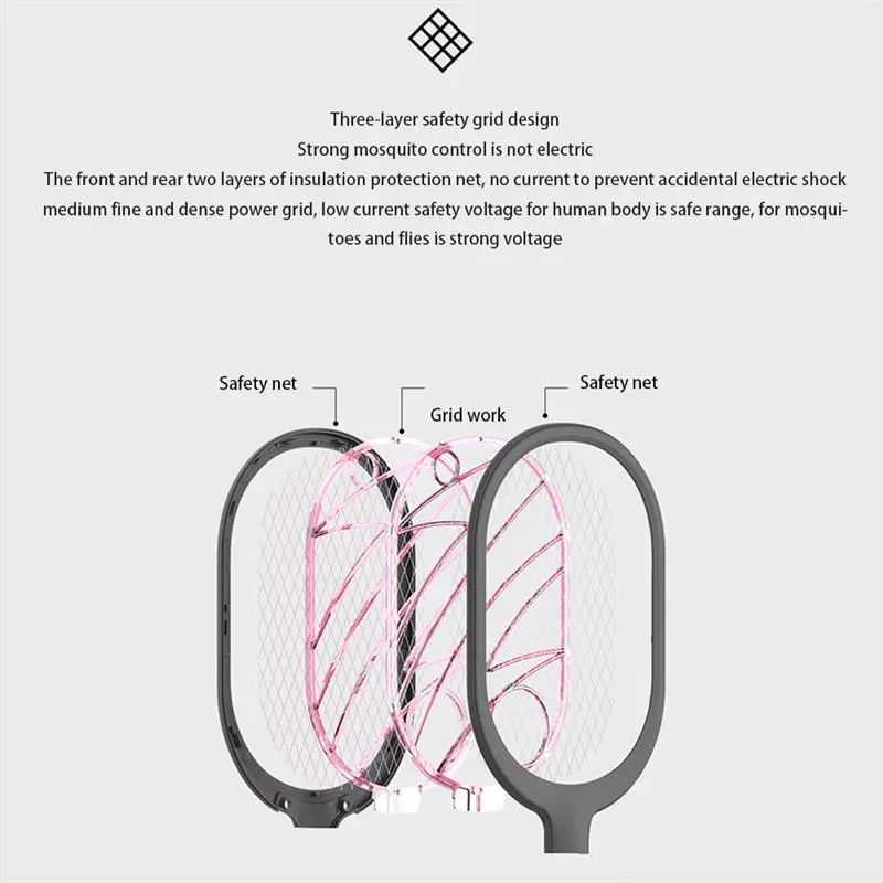 Есть два слоя изоляционных защитных сетей на передней и задней стороне, без тока для предотвращения электрического удара. Тонкая Сетка среднего уровня имеет безопасное напряжение низкого тока, которое находится в безопасном диапазоне для людей и сильное напряжение для комаров и мух.