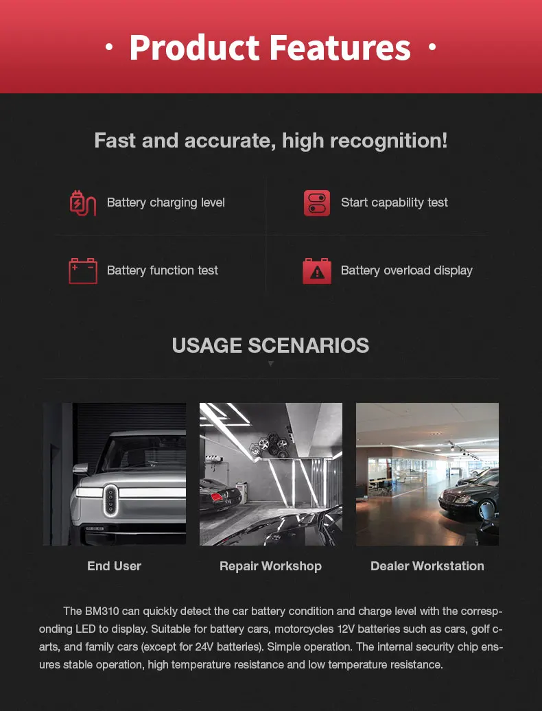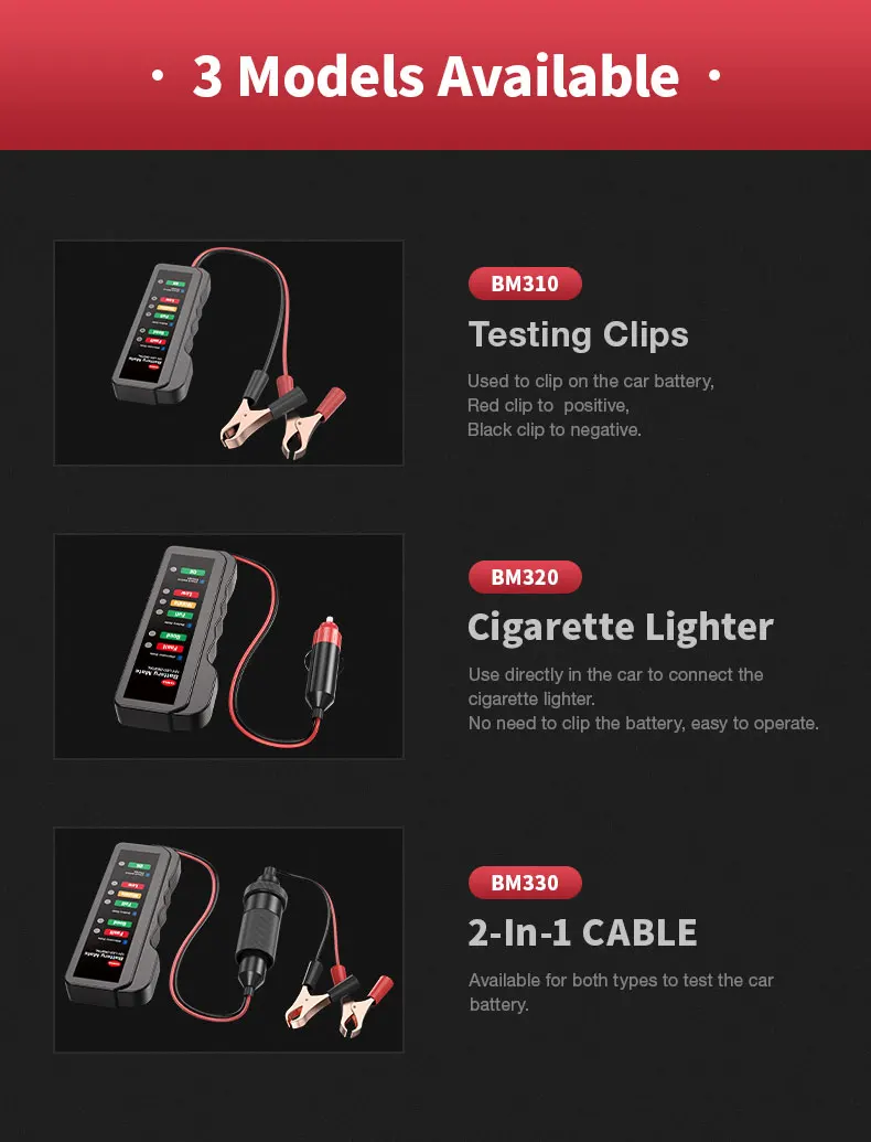 Описание товара BM310 Тестер автомобильного аккумулятора 12В автоматический тестер аккумуляторной батареи для Автомобиль и грузовик и велосипед с 6 светодиодный дисплей