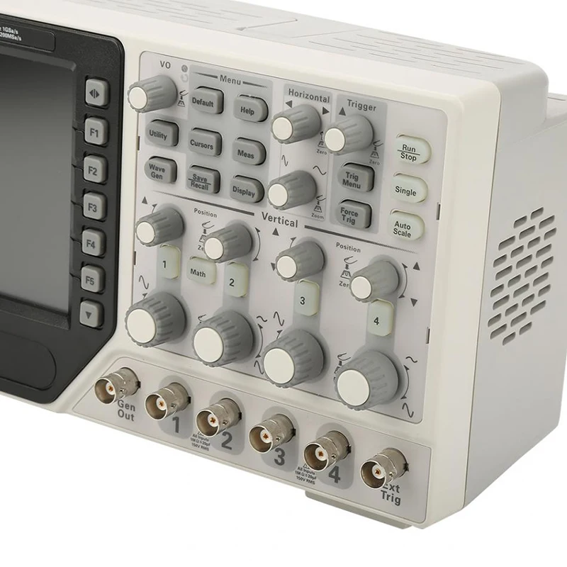 4CH осциллограф, с 1CH произвольным/функциональным генератором сигналов, независимыми клавишами осциллографа и генератором сигналов, который прост в эксплуатации в то же время .. Полоса пропускания 100 МГц, минимальный диапазон измерения 500μV /div, частота образцов 1GS/s, усовершенствованная цифровая ТРИГГЕРНАЯ система, высокая чувствительность триггера, низкое триггерное дрожание, высокое разрешение 7 дюймов 64K цветной TFT (800*480)