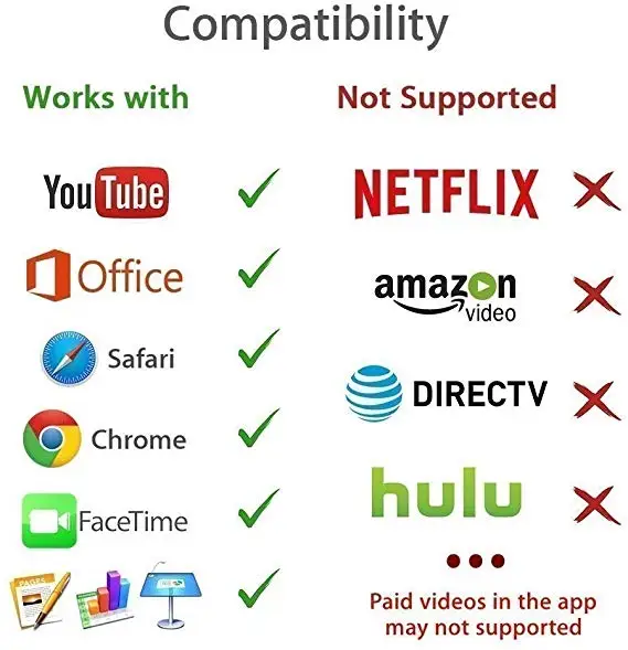 ▲ Должен быть подключен к источнику питания (5 В/1 А, iPad требует 5 В/2 а) для работы. ▲ Не совместим с Netflix / HBO GO / Xfinity Player / Amazon Prime / Hulu / Directv и другими платными видео. Посылка в комплекте. Adapter адаптер будет немного горячим во время использования, но это нормально и безопасно.