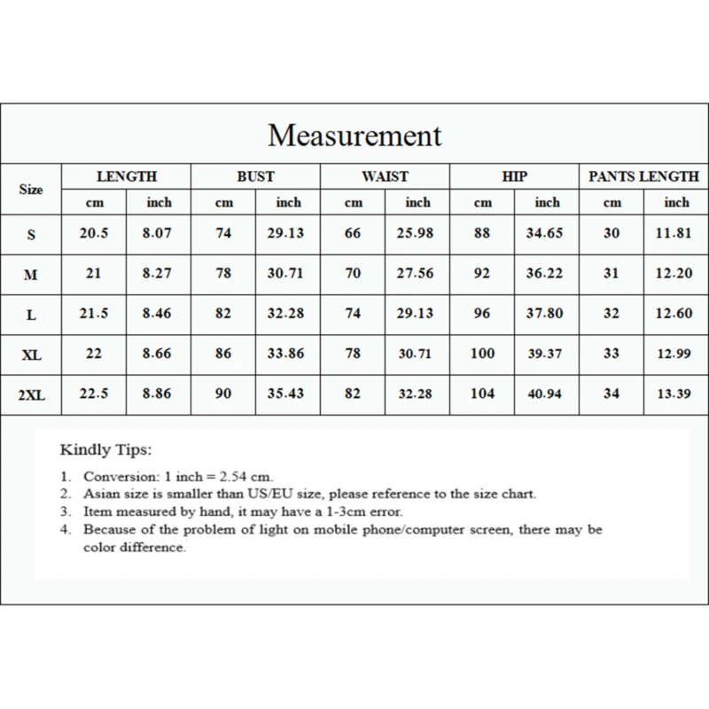 ТопДлинаБюст ТалияДлина шортБедра S20,5См74 см66 см30 см88 см М21 см78 см70 см31 см92 см L21,5 см82 см74 см32 см96 см XL22 см86 см78См33 см100 см XXL 22,5См90 см82 см34 см104 см Совет:1. Напоминаем, что из-за световых эффектов, настроек яркости/контрастности монитора и т. д. могут наблюдаться некоторые незначительные различия в цветовом тоне фотографии на сайте и фактического товара.2. Изделие измеряется вручную, оно может отличаться на 1-3 см, ваше понимание будет высоко оценено.