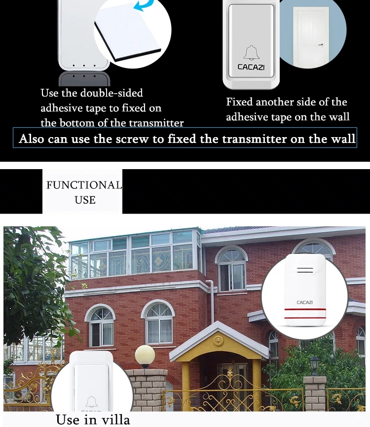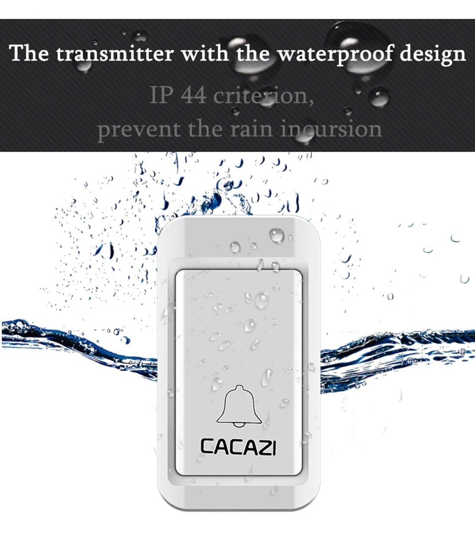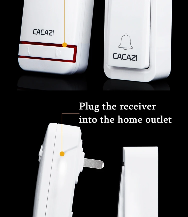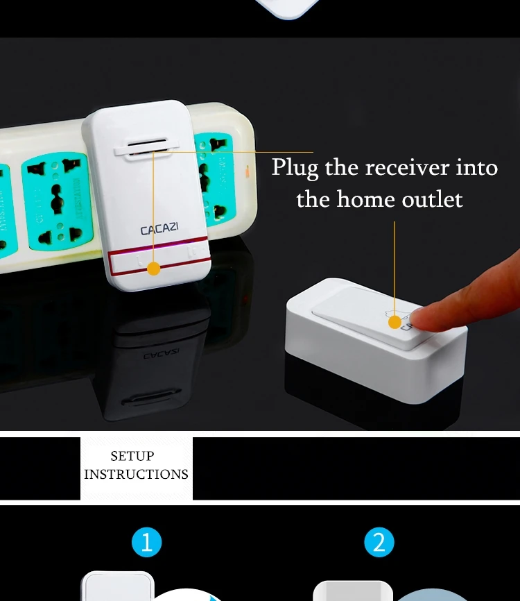 1. Нажмите кнопку, супер обучающий код может свободно научиться сочетать, может быть неограниченным подходящим приемником. 2. Вместо использования батареи, кнопка преобразует кинетическую энергию в электрическую и посылает сигнал при нажатии. 3. Передатчик может нормально работать в снежной или высокой температуре окружающей среды, водонепроницаемый и пыленепроницаемый. 4. Напряжение приемника составляет 220 В. 5. Приемник находится на расстоянии 120 метров (на открытой местности), что может быть связано с окружающей средой и препятствиями. 6. Приемник имеет 38 мелодий на выбор, и громкость составляет 20-80 дБ в 3 уровнях. 7. Приемники имеют адаптер США, ЕС, Великобритании и Австралии, подходит для большинства стран. 8. Просто подключите приемник к электрической розетке, передатчик кнопки может быть приклеен к двери с помощью клейких лент. 9. Размер кнопки: 77*45*25 мм 10. Размер приемника: 95*55*25 мм Примечание: Кнопка не может быть размещена на железной двери, потому что это будет мешать сигналу. Если приемник не звонит при нажатии кнопки после получения дверного звонка, Пожалуйста, подключите дверной звонок.
