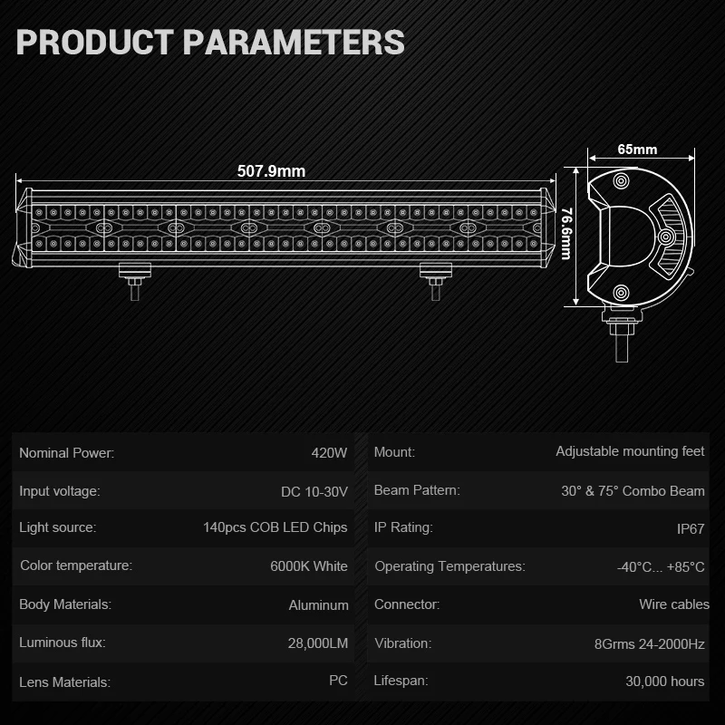 Спецификация:Номинальная мощность: 420 ВтРазмер: 20 дюймовВходное напряжение: 10-30 В постоянного токаСветильник источник света: COB светодиодный чипыЦветовая температура: 6000K белыйСветовой поток: 25,лмМатериалы корпуса: алюминийМатериалы линз: PMMAКрепление: регулируемые крепежные ножкиРисунок луча: комбинированный лучСтепень: 30 ° Точечный светильник + 70 ° прожектор светильникIP Рейтинг: IP67Рабочая температура: -40 °C... + 85 °CРазъем: положительный и отрицательный проводВибрация: 8 ГРМ 24-2000 Гц(Чип на плате) Срок службы: 30000 часовИз-за того, что продукты Батареи запрещены при международной воздушной пересылке, беспроводной пульт дистанционного управления, который поставляется из Китая, без батареи.