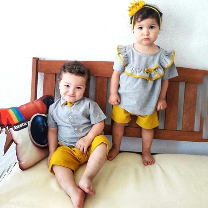 Комплекты одинаковой одежды для брата и сестры; Футболка с короткими рукавами и желтые шорты; Одинаковые летние комплекты для близнецов; F0045