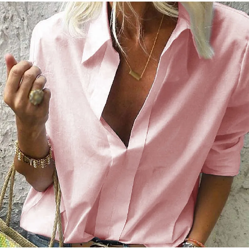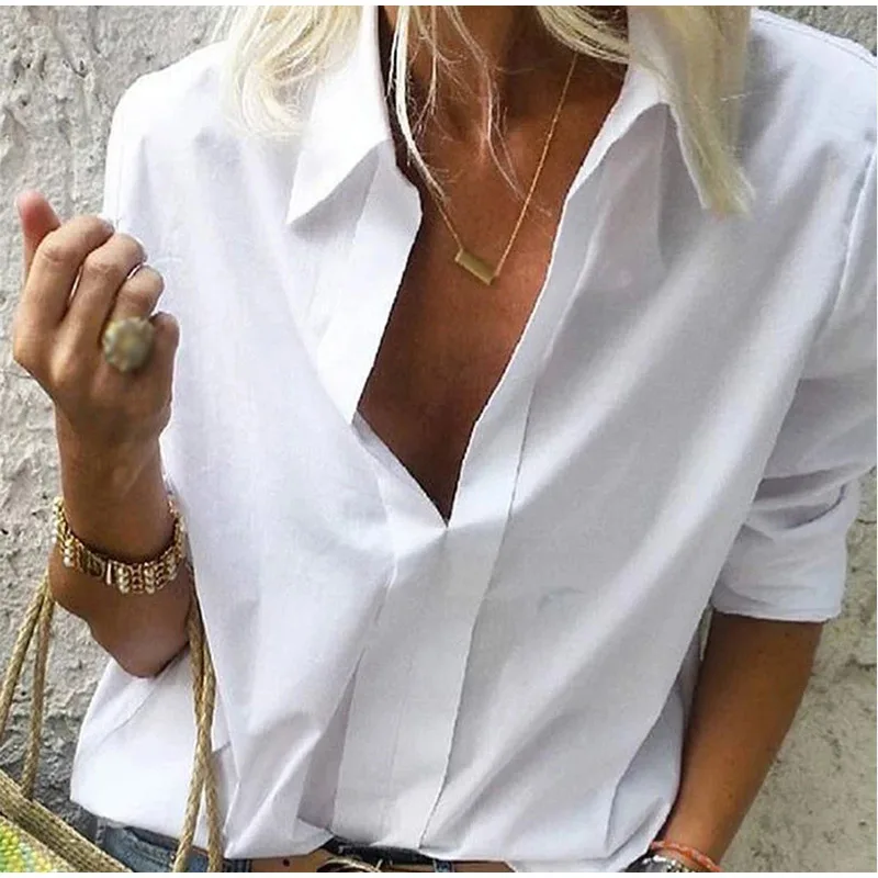 Женская рубашка с длинным рукавом и глубоким v-образным вырезом, топы размера плюс 3XL, однотонные офисные женские свободные рубашки, женские повседневные блузки на лето 2019