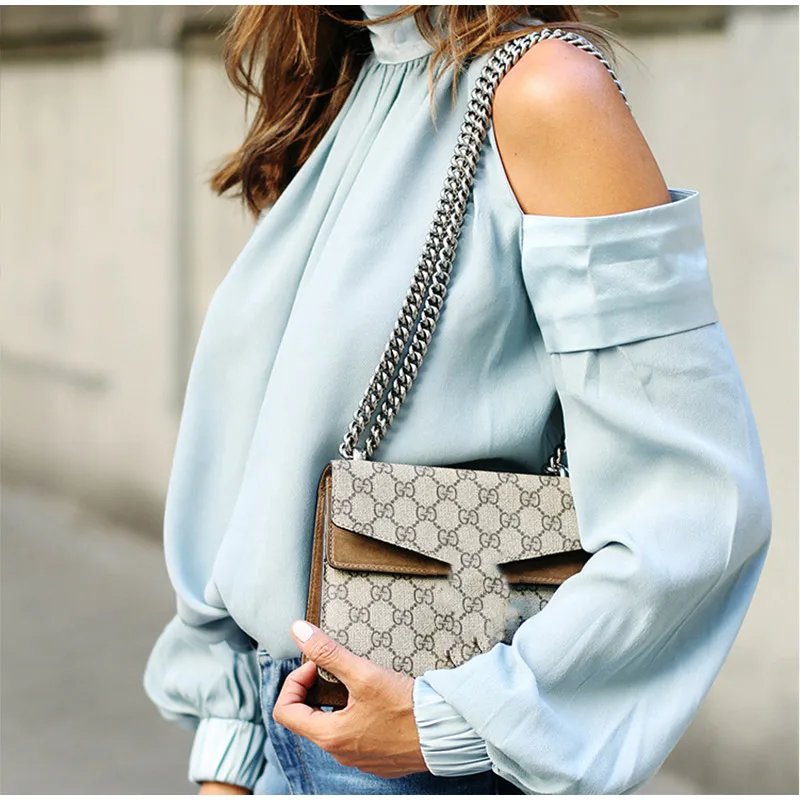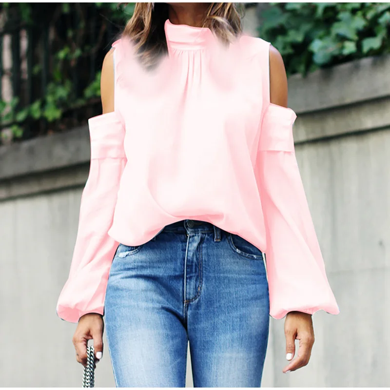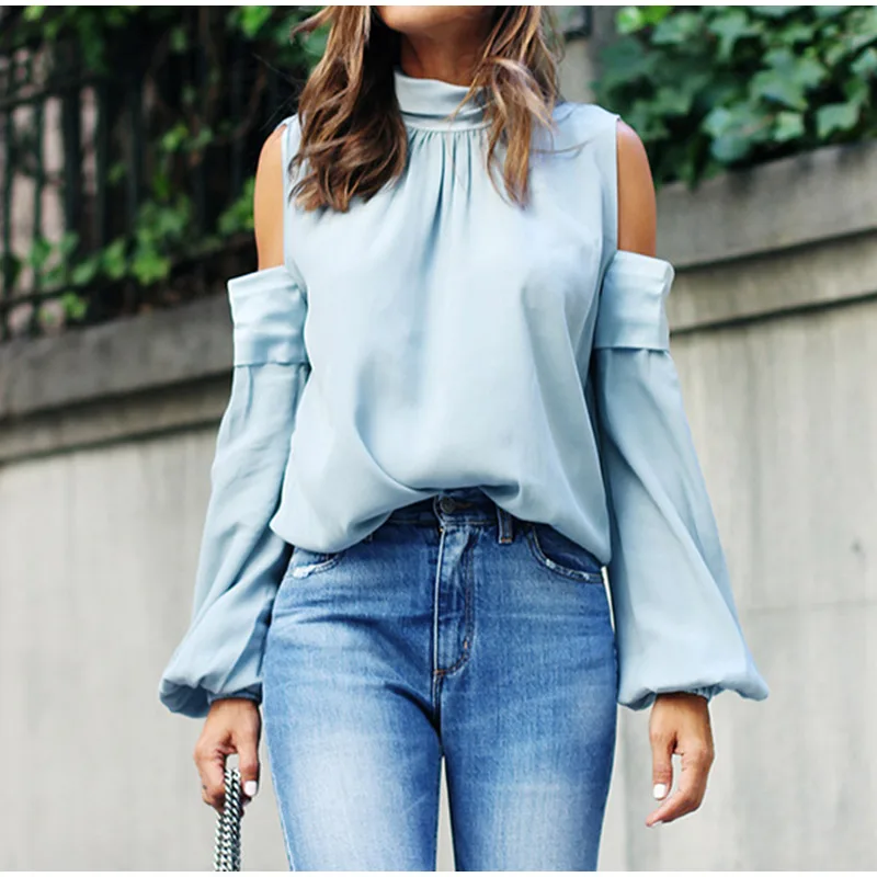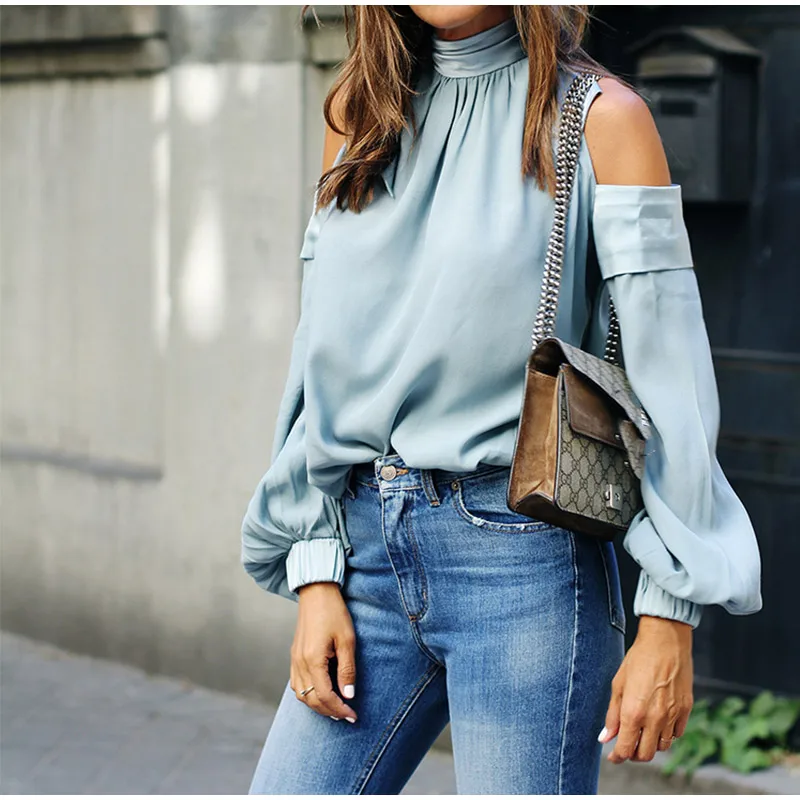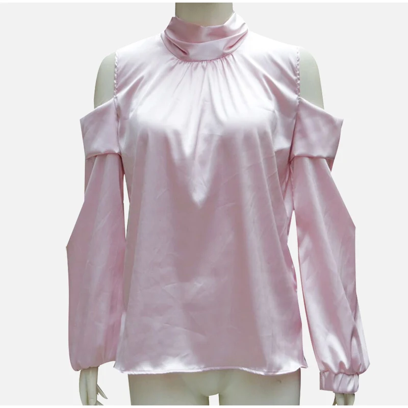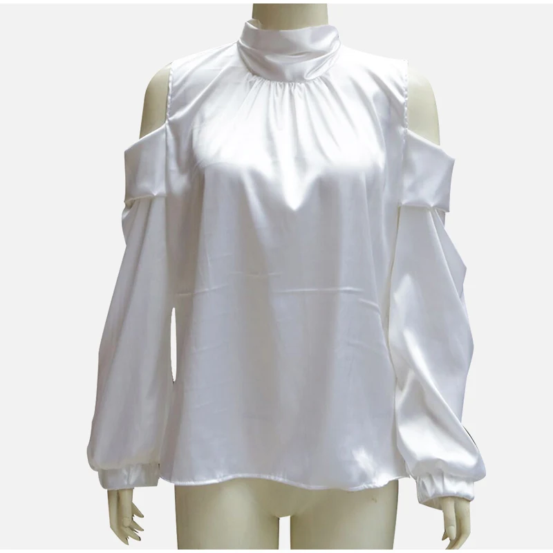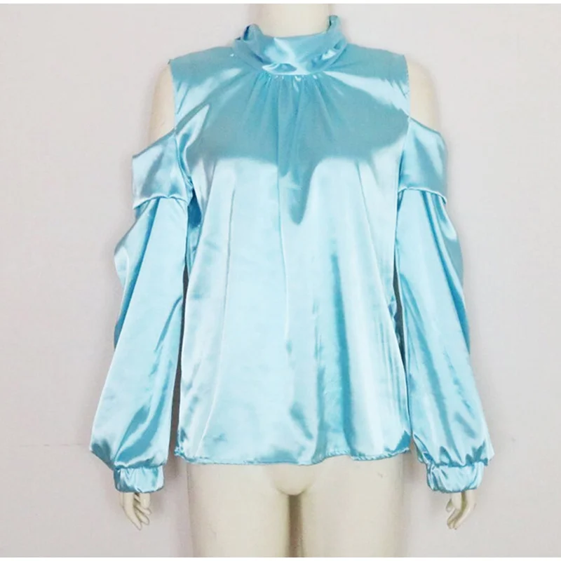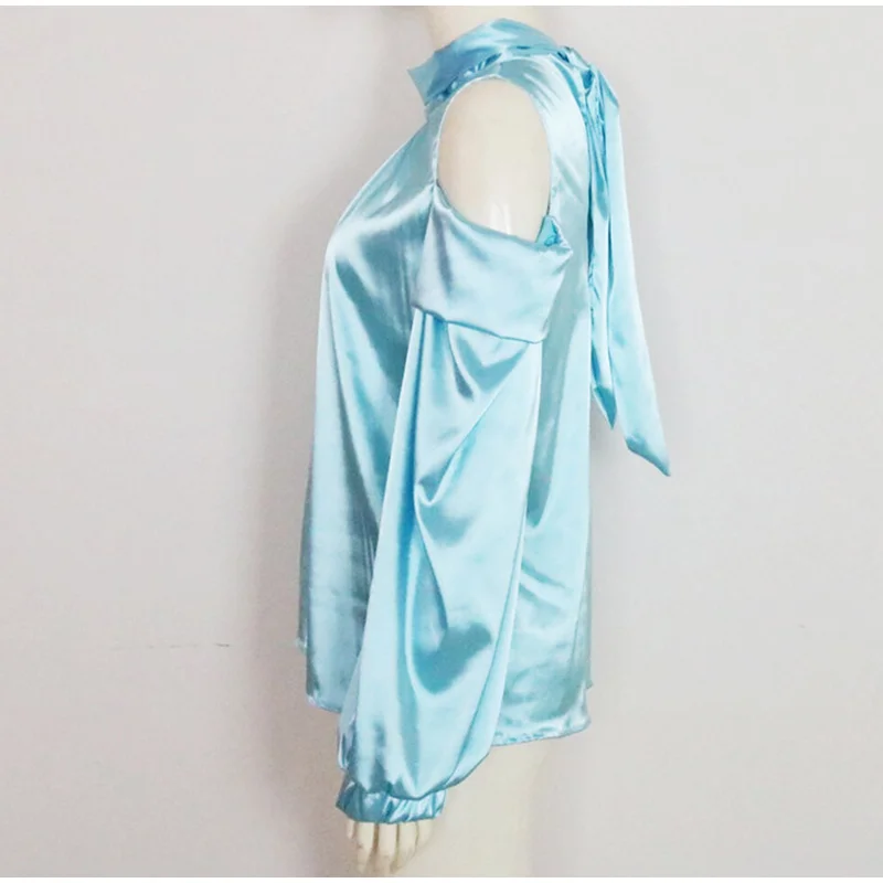 Женская атласная блузка на шнуровке, с открытыми плечами, высокий воротник, расклешенные рукава, Женские топы и блузки, летние женские рубашки 2019