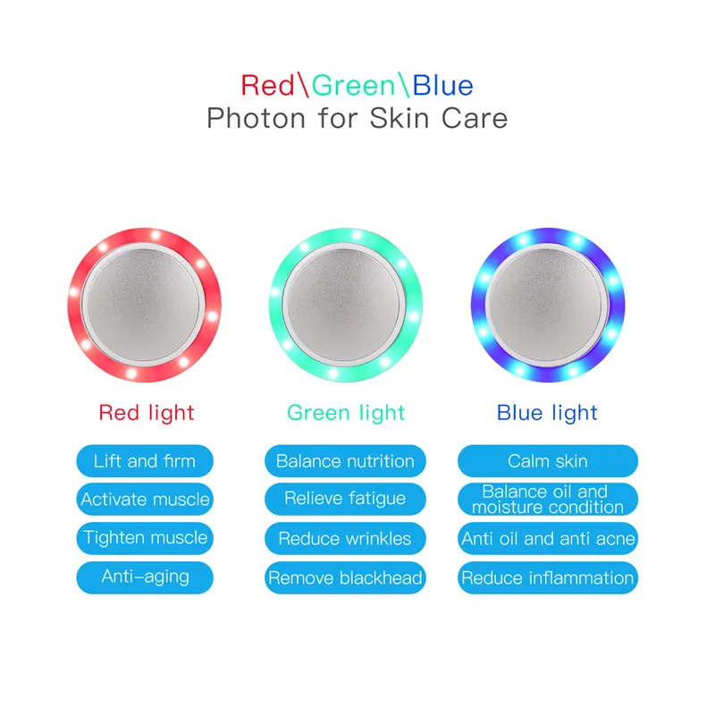 3 светодиодный светильник: 1) Красный светильник [Длина волны: 640 Нм] Подтяните и закрепите, активируйте мышцы, Затяните кожу, омолаживайте. 2) зеленый светильник [Длина волны: 531нм] Сбалансируйте питание, снимайте усталость, уменьшайте морщины, удаляйте черные точки. 3) синий светильник [Длина волны: 423 Нм] Спокойная кожа, баланс масла и влажности, анти-масло и анти акне, уменьшает воспаление. Простота в эксплуатации: 1) Нажмите кнопку [светодиодный/Мощный], чтобы включить/выключить устройство. 2) Короткое нажатие кнопки [светодиодный/Мощный] для выбора светодиодный светильник. 3) Нажмите [теплую] кнопку для горячей терапии. 4) нажмите кнопку [COOL] для холодной терапии. 5) нажмите кнопку [светодиодный/Мощный] для выключения питания.