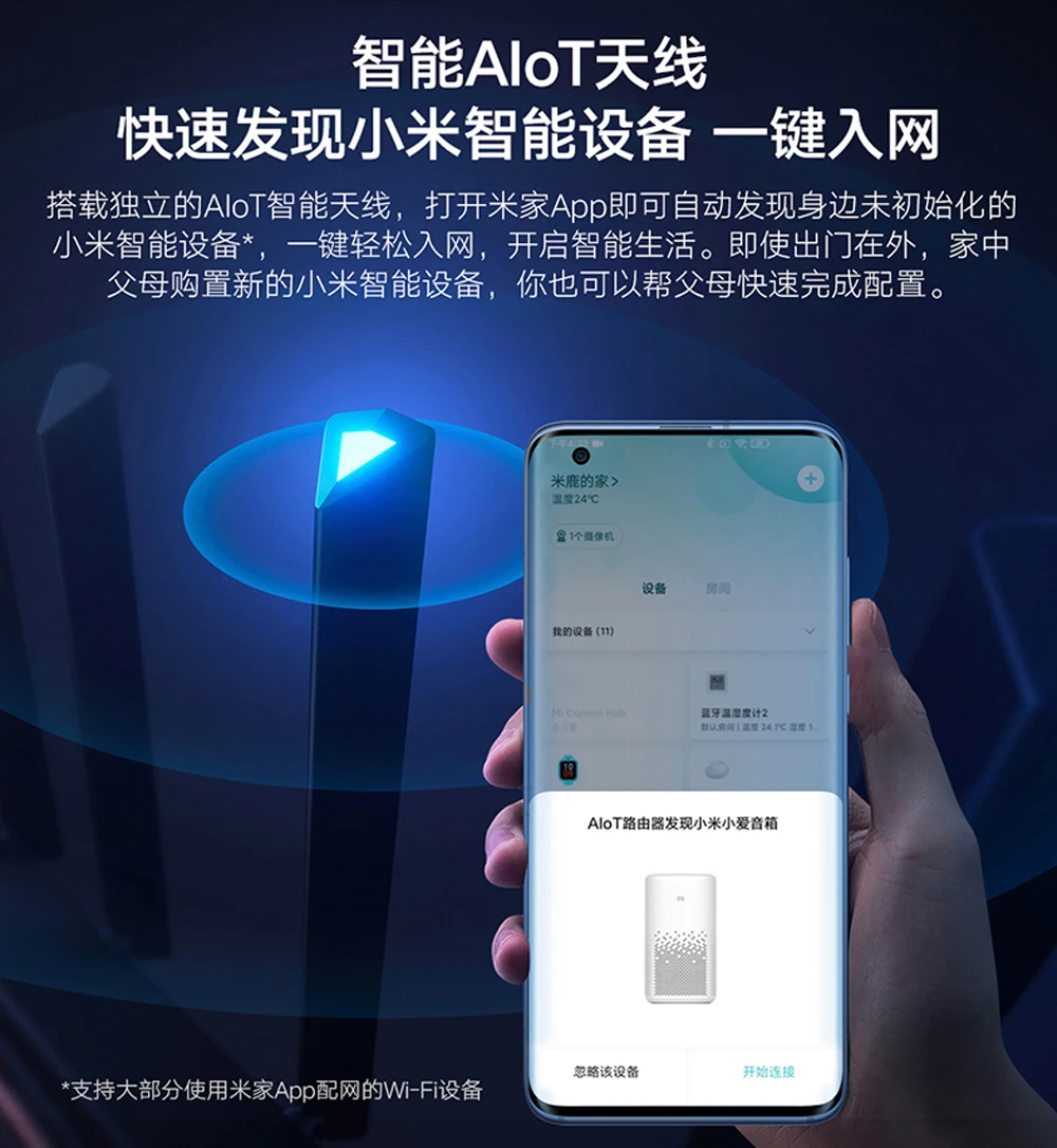Оснащен «Смарт-антенной AIoT», откройте приложение Mi Home, чтобы открыть неинициализированные смарт-устройства Mi. Подключитесь к сети и получите доступ к широкому спектру интеллектуальных функций одним нажатием кнопки. Вы можете помочь своим родителям быстро настроить свои новые устройства, даже когда вы находитесь вдали от дома.