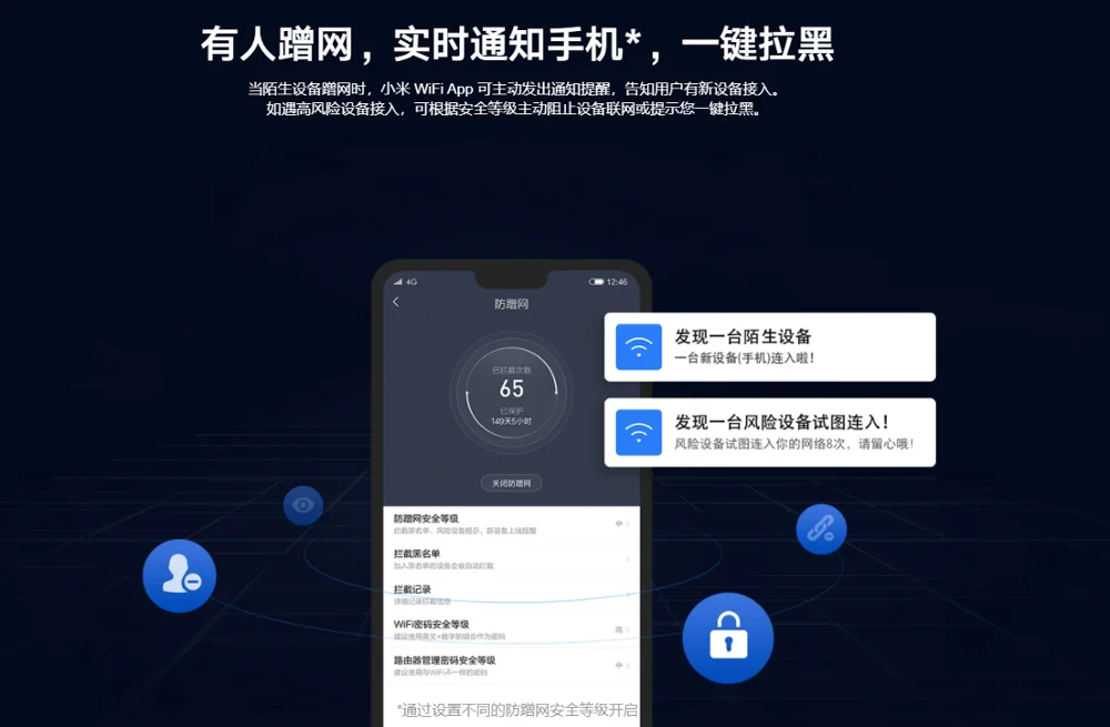 Когда неизвестное устройство использует Wi-Fi без разрешения, приложение Xiaomi Wi-Fi может отправить уведомление, чтобы сообщить пользователю, что новое устройство подключено. Если подозрительное устройство пробует подключиться к сети, в зависимости от уровня безопасности, устройство будет автоматически заблокировано от подключения, или вам будет предложено блокировать устройство одним нажатием кнопки.