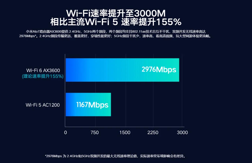 Mi AIoT маршрутизатор AX3600 предлагает два диапазона 2,4 ГГц и 5 ГГц, каждая с 802.11ax технологии и не мешать друг другу. Два диапазона обеспечивают комбинированную двухдиапазонную беспроводную скорость до 2976 Мбит/с. 2,4 ГГц частота браслетом из нержавеющей стали всегда больше коробка передач для наилучшего покрытия и лучше смеситель для ванной комнаты, проникать сквозь производительности. Частотный диапазон 5 ГГц обеспечивает низкую интерференцию и высокую скорость для плавного воспроизведения видео в формате HD и плавного воспроизведения при больших онлайн-играх.
