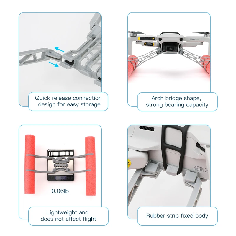 Легкий, портативный, легко носить с собой и устанавливать, чтобы идеально защитить ваш Mavic Mini. Высокая стабильность, устраняет качание, позволяет более плавные посадки и обеспечивает плавную посадку на различных нестабильных поверхностях. Легкий, портативный, легко носить с собой и устанавливать, он может использовать ваш Дрон, летающий на реке и озерах, вы можете использовать его, снимая и приземляясь на озеро, не беспокойтесь о том, что ваш Дрон утонет. Плавучие стержни могут быть установлены, чтобы позволить Mavic Mini снимать и приземляться на воде, это может позволить вам играть в воде или море Примечание: Не ходите, чтобы иметь волну воды места, в противном случае будет опасность перевернуть, чтобы летать в спокойном месте воды.