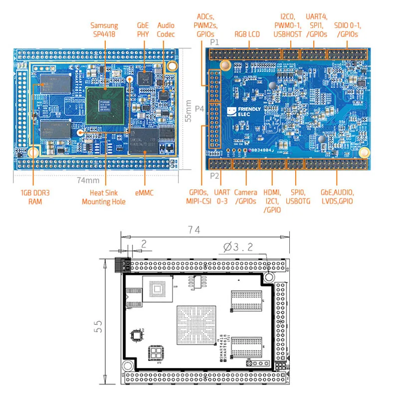 CPU: Samsung S5P4418 Quad Core Cortex-A9, with dynamic frequency scaling from 400M Hz to 1.4G Hz PMU Power Management Unit: AXP228. it supports software power-off and wake-up functions. DDR3 RAM: 1GB 32bit DDR3 RAM Ethernet: Gbps Ethernet(RTL8211E) with unique MAC eMMC: 8GB Audio: 1 x audio codec chip, 1 x onboard Microphone and 1 x audio jack LED: 1 x Power LED, 2 x GPIO LED Others: onboard thermistor PCB Dimension: 74 x 55 mm, Six-Layer Power: DC 5V, up to 1.2A Temperature measuring range: -40℃ to 80℃ OS/Software: u-boot, Android5.1/4.4, Debian8, ubuntu-core 3 x 2.0mm pitch double row pin header, 174 pins in total: USB 2.0 - Host x1, OTG x1 Video output/Display - RGB Parallel I/F (24-bit), LVDS and HDMI-compatible 1.4a Video input - DVP Camera interface, ITU-R BT 601/656 8-bit and MIPI-CSI Audio input - Microphone Audio output - Audio jack (with headset detection) and HDMI-compatible audio Ethernet - 10/100/1000Mbps Ethernet x 1 ADC - CPU internal ADC, 7 channels, 12-bit, range: 0 ~ 1.8V External interface - SDIO/MMC x2, SPI x2, I2C x3, UART x5, PWM x3, GPIOs x24 Others - Power key input, RESET input, RESET output, RTC battery input