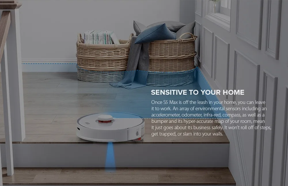 Как только S5 Max отключен от поводка в вашем доме, вы можете оставить его на работу. Массив датчиков окружающей среды, включая Акселерометр, одометр, инфра-красный, компас, а также бампер и его гиперточную карту вашей комнаты, значит, это просто безопасно для своего бизнеса. Он не скатывается со ступенек, не ловится или не хлопнет в ваши стены.