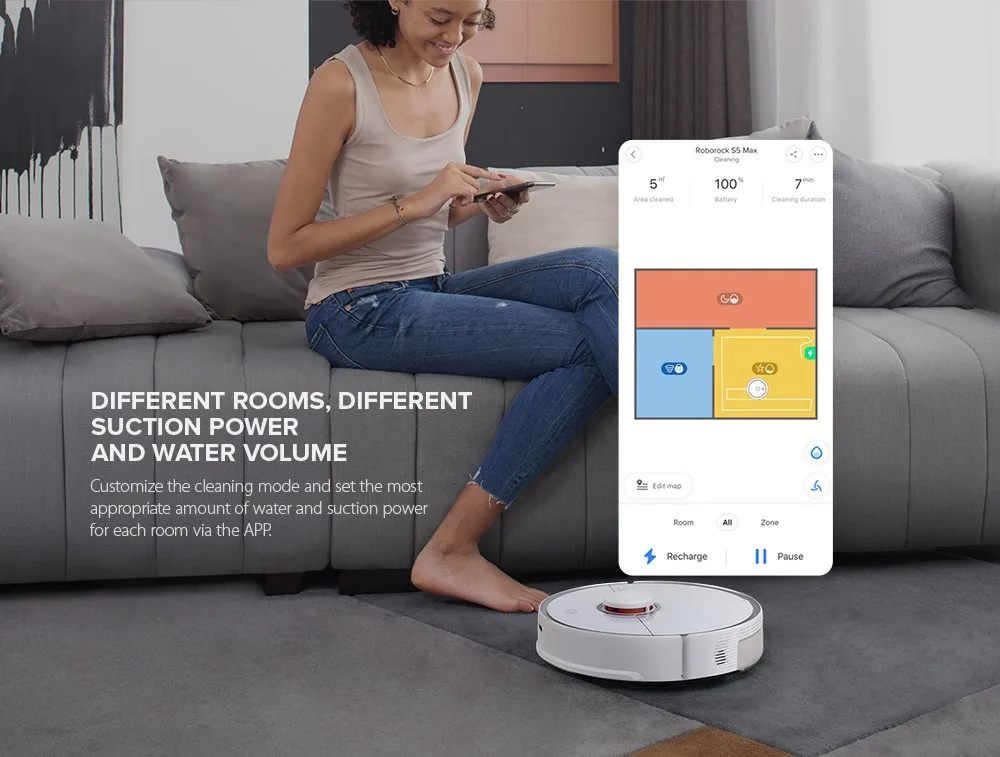 Настройте режим очистки и установите наиболее подходящее количество воды и мощности всасывания для каждой комнаты через приложение