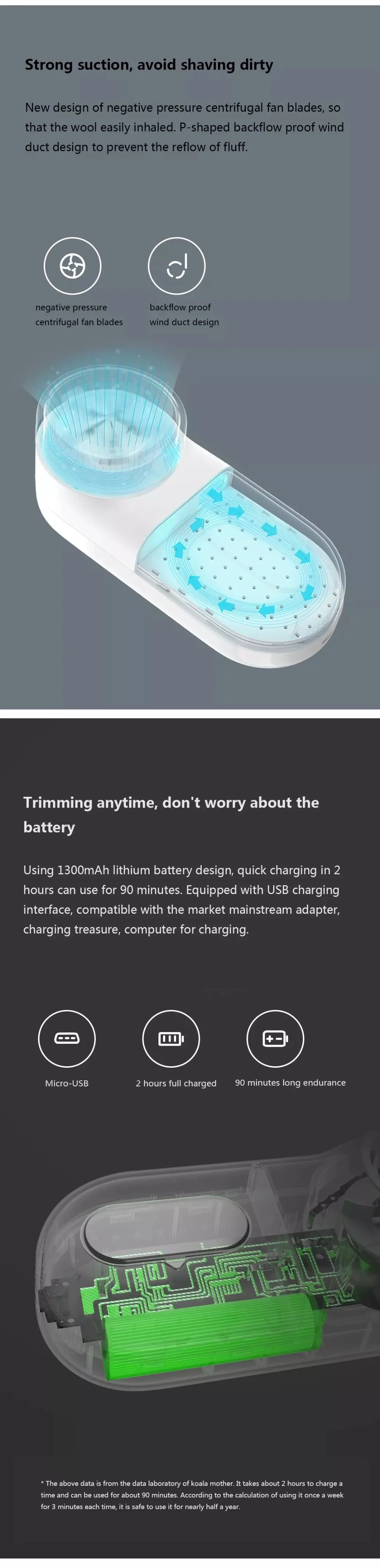 Особенности: Плавающая режущая головка циклона Утолщенная микродуговая Защитная ткань, сетка Глубокая очистка одежды не разрушает Конструкция воздуховода с защитой от обратного потока, чтобы не испачкаться USB зарядка, 2 часа полной зарядки, может служить 90 минут Параметры: Бренд: Xiaomi Mijia Название: переносное средство для удаления ворса/бритва из Ткани Fuzz Вес нетто: 213 г Размер продукта: 145x62x65mm Входные параметры: 5 В = 1 А Номинальное напряжение: 3,7 В пост. Тока Номинальная мощность: 2 Вт