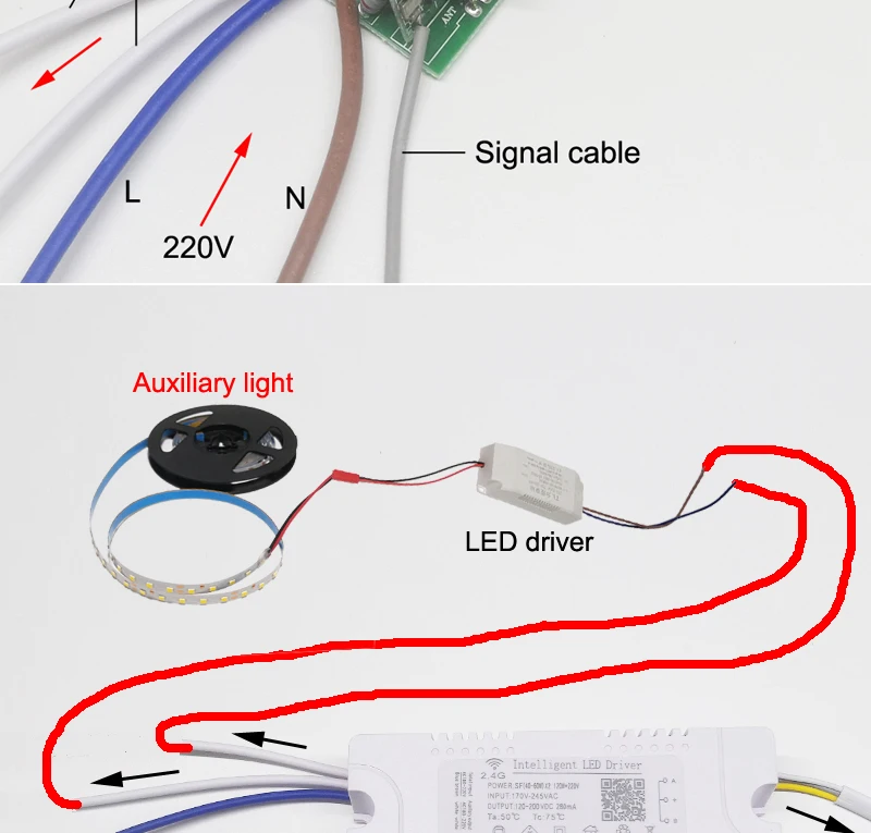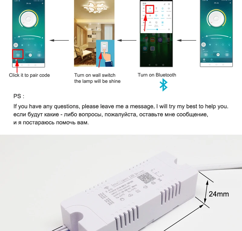 Технические характеристики Название: 2,4 г светодиодный драйвер приложение управления светодиодный трансформатор Мощность: (40-60 Вт) x2 + 220 В Вход: 165-265V 50/60Hz Выход: 120-200VDC 240mA Управление: 2,4G пульт дистанционного управления и приложение Bluetooth Применение: светодиодный потолочный светильник и т. Д.