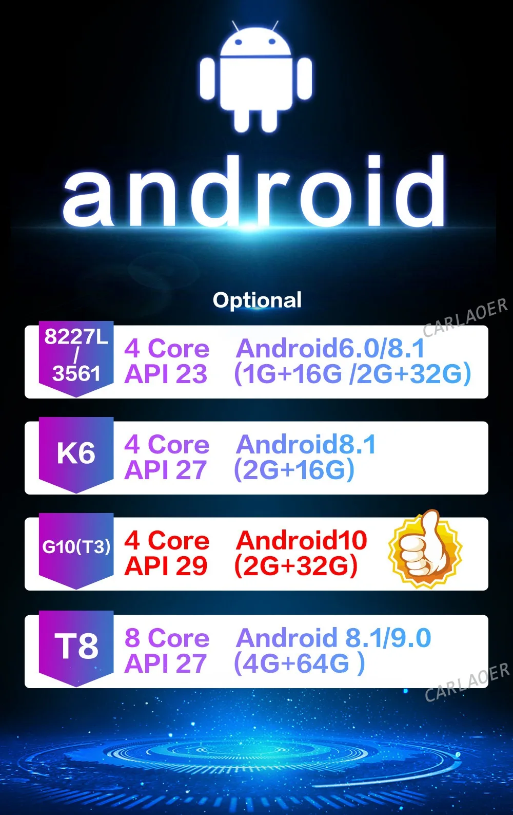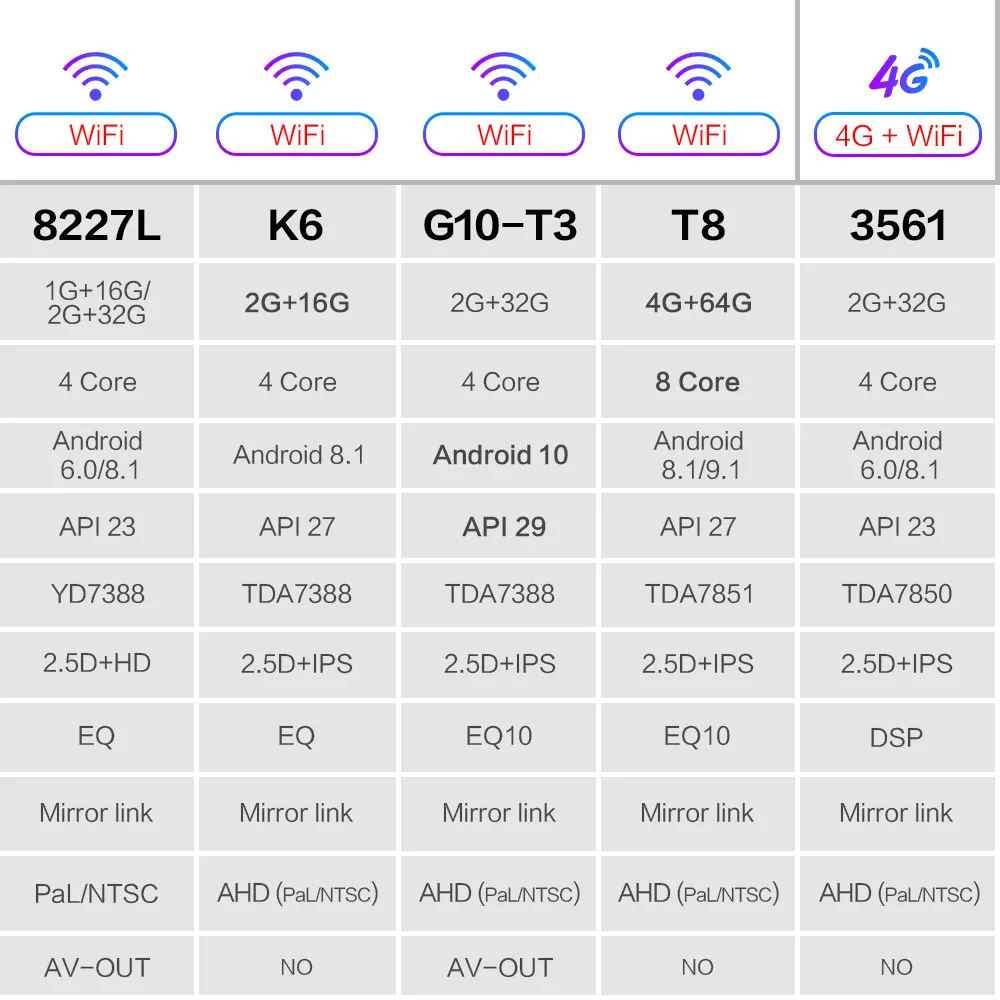 Вы можете выбрать больше конфигураций. Определенно есть лучшая модель для ваших нужд. 8227L-это модель с самым большим объемом продаж на рынке. Он очень популярен с 1 Гб + 16 ГБ и 2 Гб + 32 ГБ опциями. K6-новая версия. Его основной объем-2 Гб ОЗУ + 16 Гб ПЗУ. Я рекомендую вам выбрать G10-T3 модель. Это последняя версия этого года и последняя ОС Android 10 (RAM + ROM: 2 ГБ + 32 ГБ) очень высокая. В центре внимания данной модели T8 составляют 8-ядерный Процессор + 4 Гб Оперативная память + 64 Гб Встроенная память + 7851. Если вам нужна версия 4G + WiFi, вы можете выбрать модель 3561, которая имеет 2 ГБ + 32 ГБ, что очень хорошо.