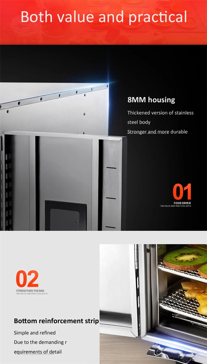 Product name: Fruit dryer Working voltage: 220V/50HZ Power:max 5400W Grid size: 670mmX670mm, mesh 8mm Product weight: machine + grid total about 95 kg Temperature setting range: 40~90 degrees Celsius Product size: 880mm (length) x700mm (width) x 1450mm (height) Timing setting range: 0~15 hours, with normally open function Number of mesh layers: 24 layers, upper and lower mesh layer spacing 50mm Product material: all stainless steel material (body, mesh)