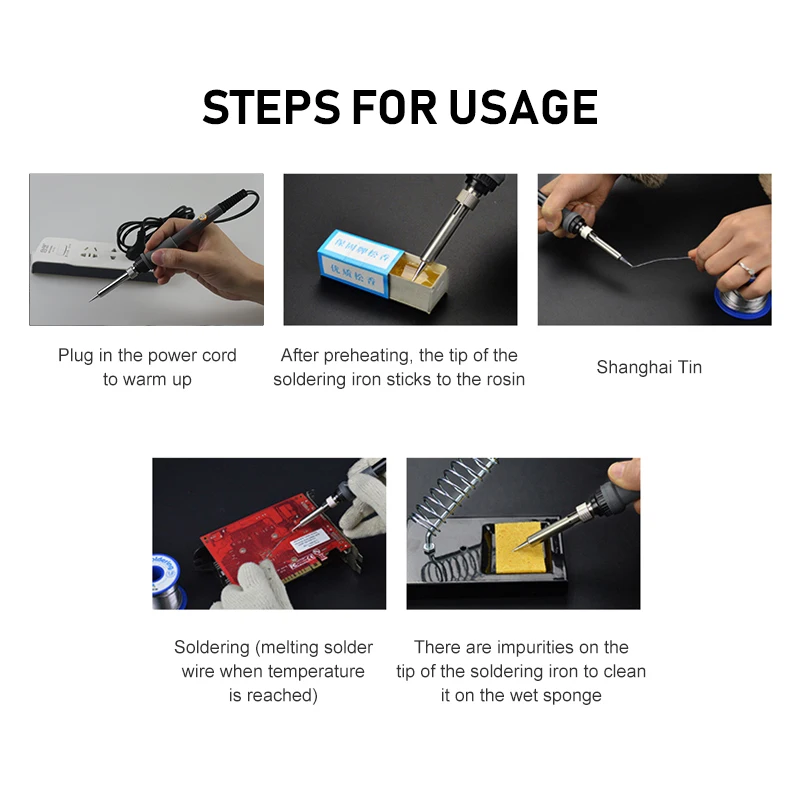 -- Очистите детали для соединения -- Очистите наконечник паяльника и «Олово» всех граней наконечника с покрытием припоя -- Тепловые части (не припой), которые должны быть соединены -Нанесите флюс-сердцевину припоя на нагреваемые части, не припаивайте, пока не припаиваете мне паяльный наконечник, и нагревайте его, пока припой не плавится и не течёт свободно.