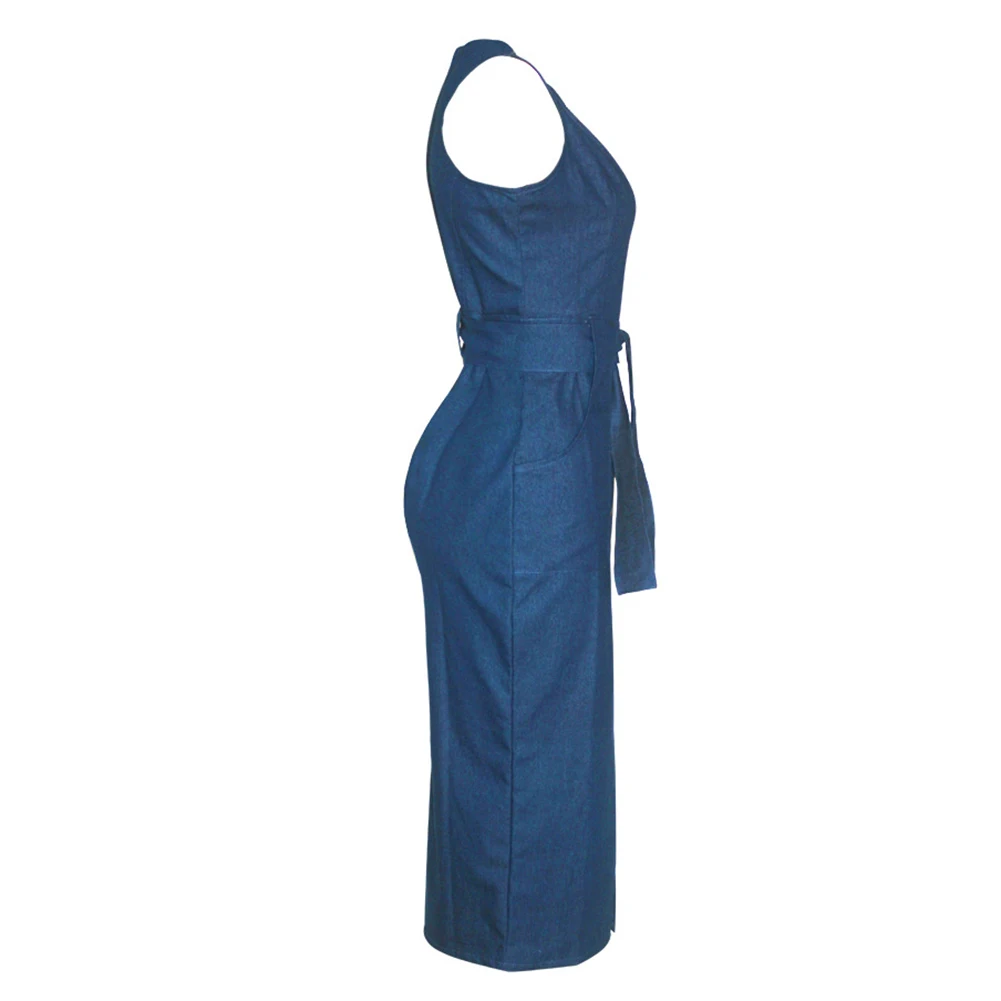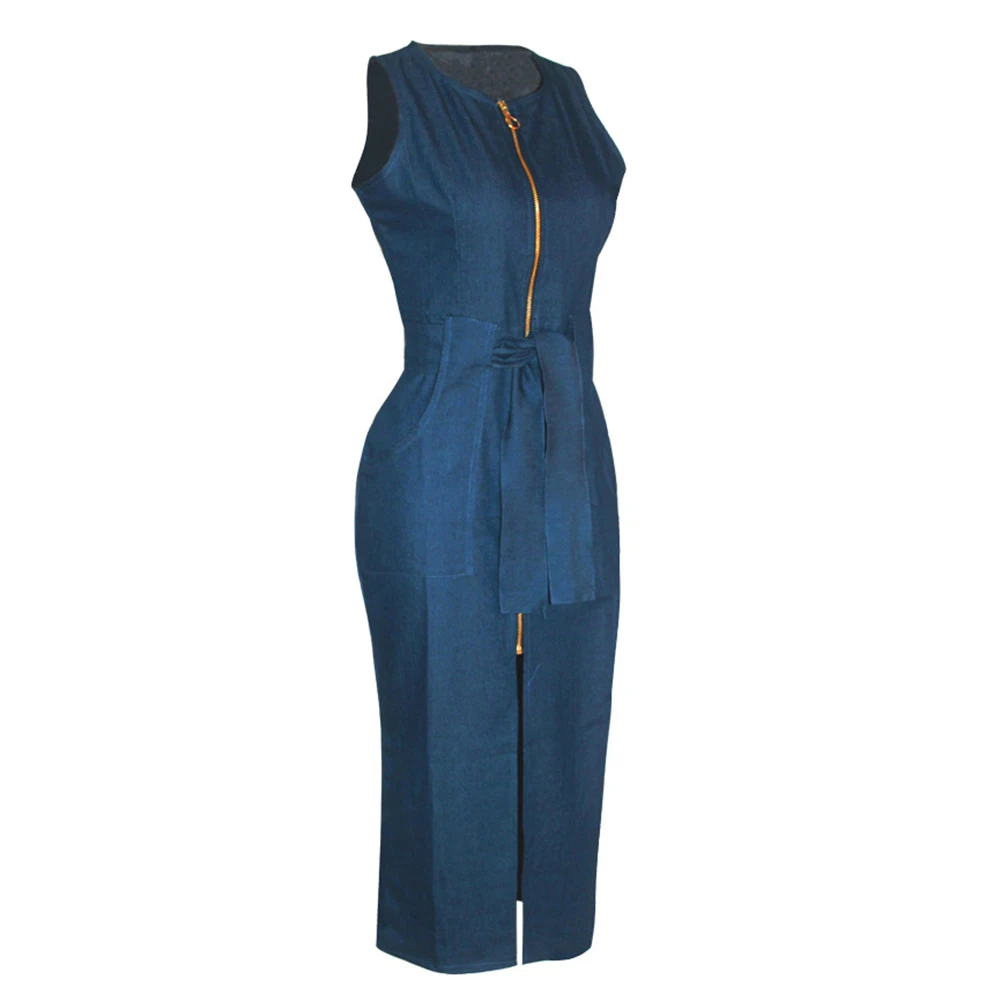Женское привлекательное однотонное облегающее джинсовое Клубное платье без рукавов на молнии повседневное длинное платье Вечерние